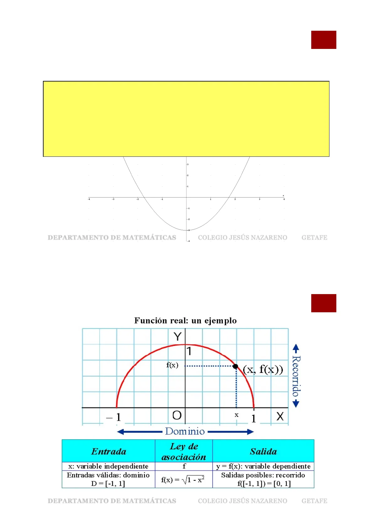 Tema 7: Limites y Continuidad 3 Función real: un ejemplo Y 1 f(x) (x, f(x)) + Recorrido -1 O x 1 X Dominio Entrada Ley de asociación Salida x: variable independiente f y = f(x): variable dependiente Entradas válidas: dominio D=[-1, 1] f(x) = \/1 - x2 Salidas posibles: recorrido f([-1, 1]) = [0, 1] DEPARTAMENTO DE MATEMÁTICAS COLEGIO JESÚS NAZARENO GETAFE y 3 y = = = − 3 2 f -3 -2 -1 2 2 x 3x