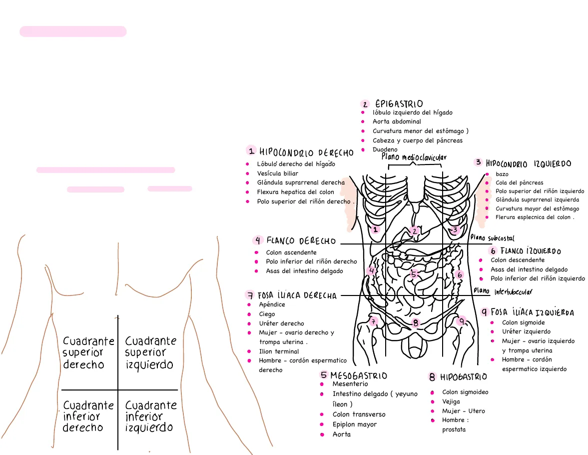 Están delimitados con el plano transumbilical ( horizontal , a nivel de L3-L4) y el plano medio ( vertical ) . Estos cuadrantes nos ayudan a ubicar órganos específicos y son claves para la exploración física , ya que guían dónde debemos auscultar , percutir o palpar.