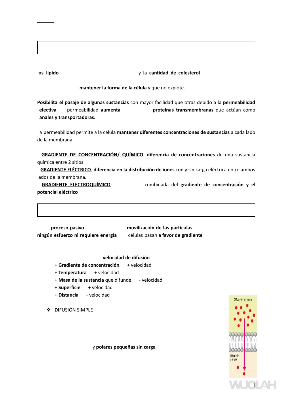 Proceso pasivo basado en el movimiento libre de sustancias a través de la bicapa lipídica sin la ayuda de proteínas transportadoras. Moléculas hidrófobas apolares sin carga (O2, CO2, N2, ácidos grasos y vitaminas liposolubles -> A, D, E, K) y polares pequeñas sin carga (agua, alcohol y urea). Difusión simple Difusión simple WUGLAHTEMA 2: FISIOLOGÍA CELULAR