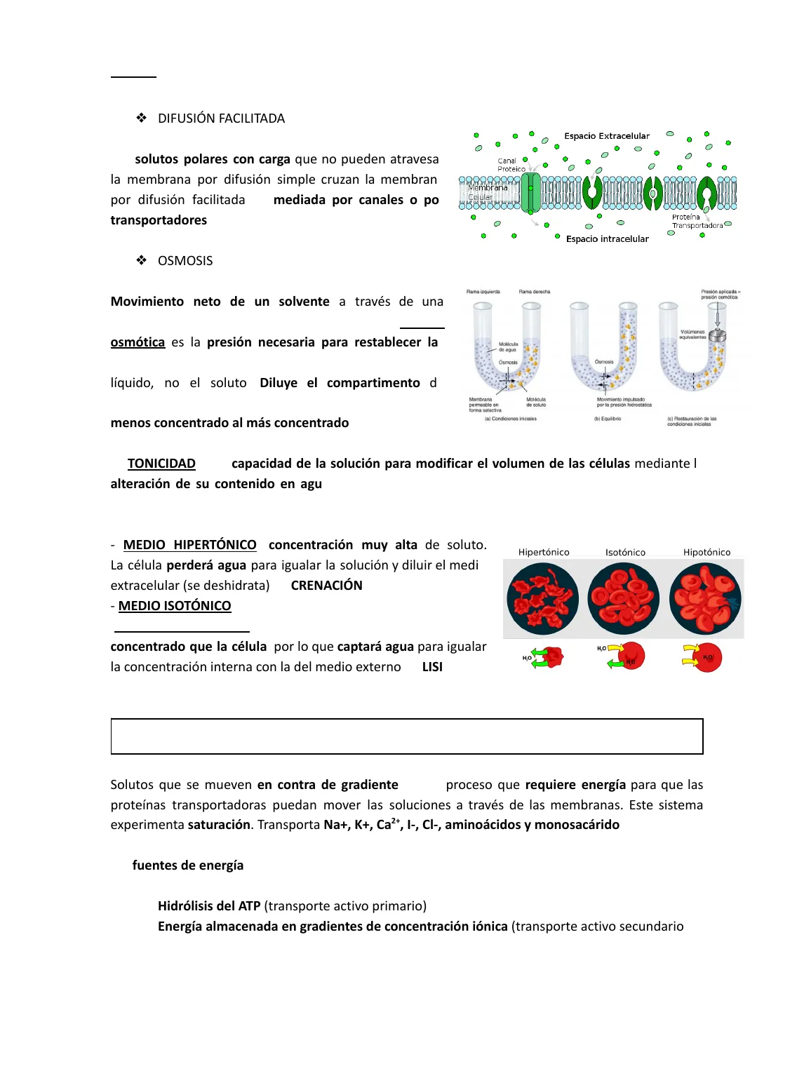 ❖ OSMOSIS Movimiento neto de un solvente a través de una membrana con permeabilidad selectiva. La presión osmótica es la presión necesaria para restablecer las condiciones iniciales (detener la osmosis). Se mueve el líquido, no el soluto. Diluye el compartimento de manera que la concentración se iguale. Pasa del medio menos concentrado al más concentrado. Espacio Extracelular Canal Proteico "Membrana Celular Proteína Transportadora Espacio intracelular Rama izquierda Rama derecha Presión aplicada = presión osmótica Volúmenes equivalentes Molécula de agua Ósmosis Ósmosis Membrana permeable en forma selectiva (a) Condiciones iniciales Molécula de soluto Movimiento impulsado por la presión hidrostática (b) Equilibrio (c) Restauración de las condiciones iniciales La TONICIDAD es la capacidad de la solución para modificar el volumen de las células mediante la alteración de su contenido en agua. Las células (y las soluciones intravenosas) deben estar en un medio isotónico.