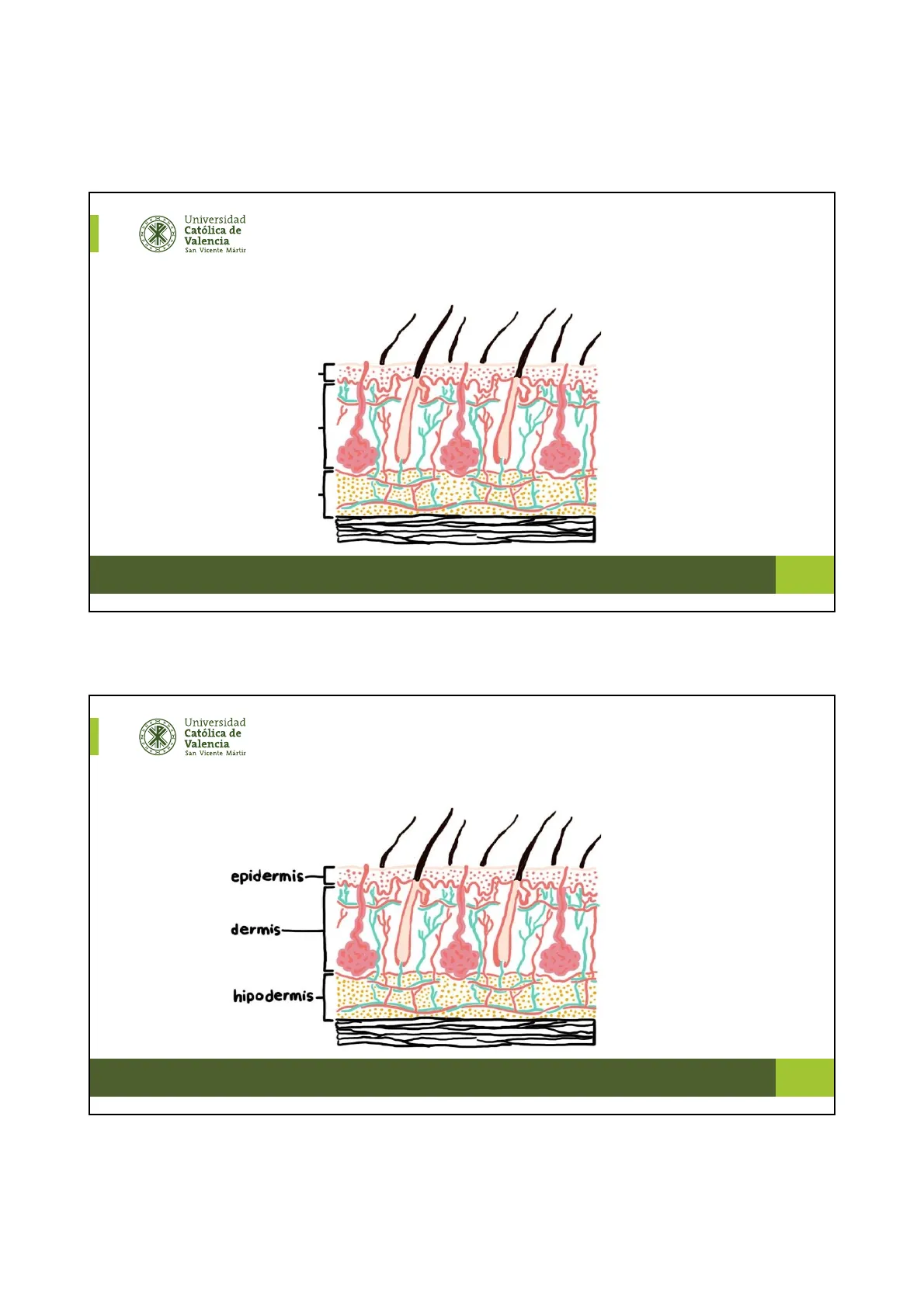 Diapositivas de la Universidad Católica de Valencia sobre Anatomía de la Piel. El Pdf detalla la estructura, composición y funciones de la piel, incluyendo la epidermis, dermis e hipodermis. Este material de Biología es ideal para estudiantes universitarios, ofreciendo un resumen claro y conciso de los principales aspectos anatómicos.