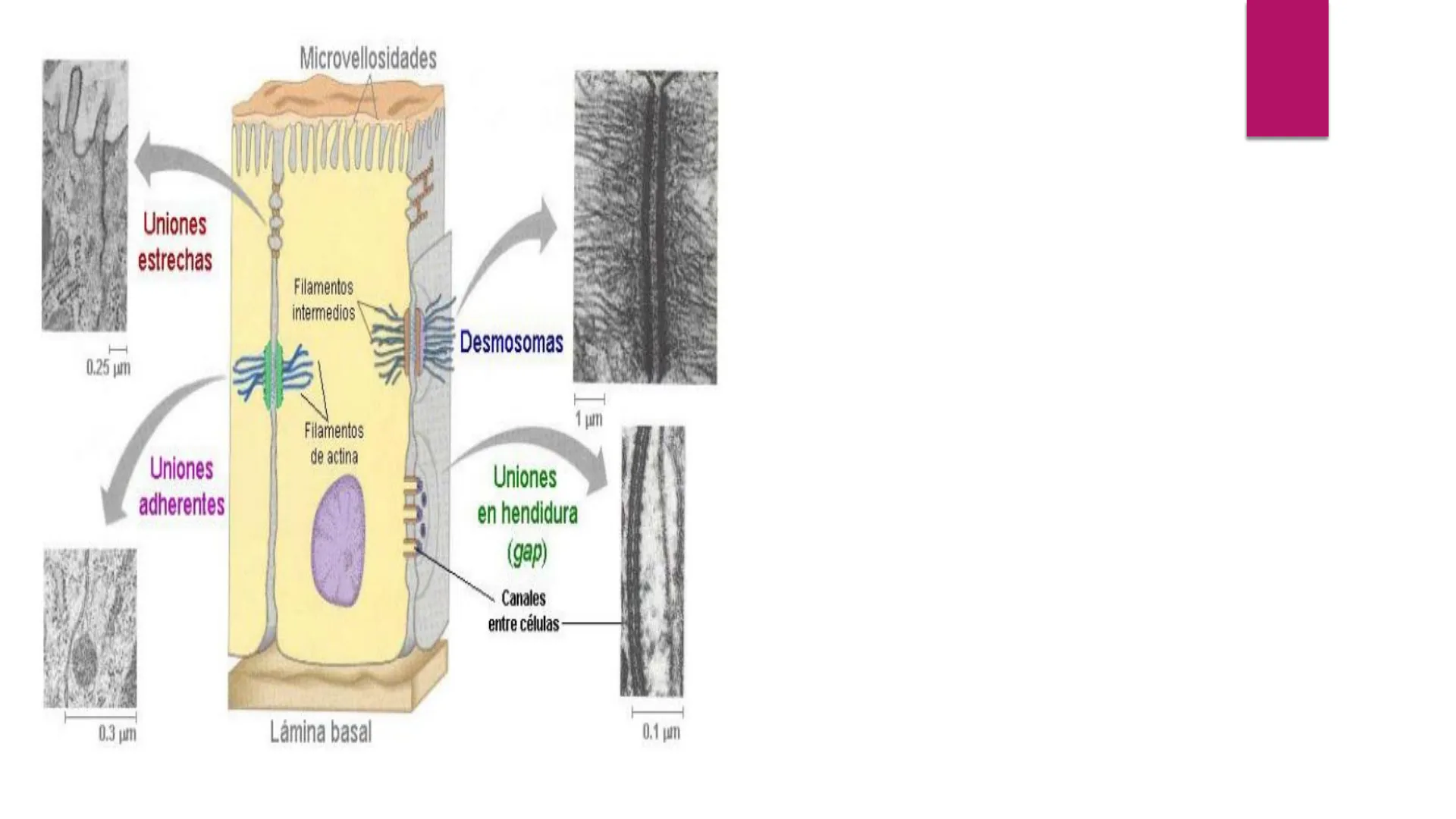- Barreras con permeabilidad selectiva al paso de sustancias de un lado a otro del epitelio - Barreras al movimiento de proteínas membranales (generan polaridad celular) - Por ejemplo: barrera hematoencefálica, reabsorción de Mg2+ a nivel renal, impermeabilidad de la piel al agua Las células pueden modificar las uniones herméticas en respuesta a señales. Lumen Microvello Empalme fuerte Célula Fluido extracelular interacting plasma membranes A intercellular space 0.6 um sealing strands of tight- junction proteins cytoplasmic half of lipid bilayer cell 1 cell 2 (A) Transporte paracelular