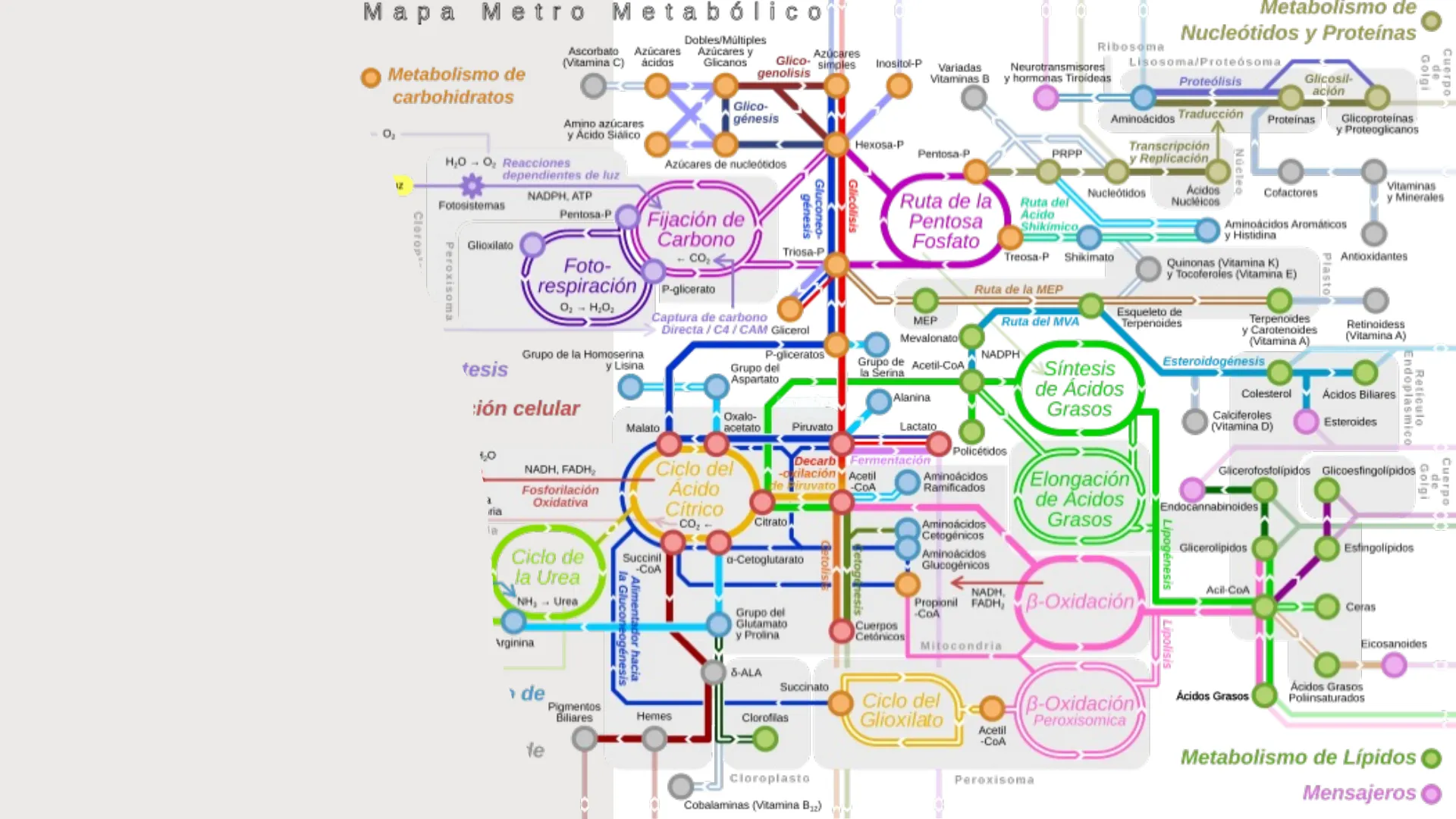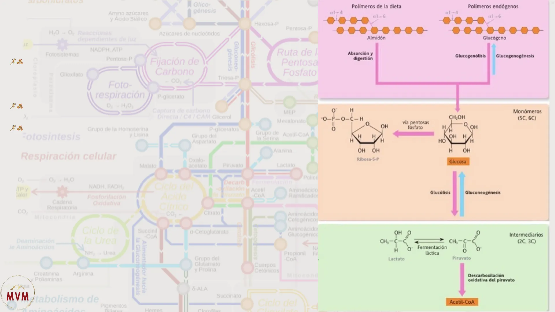Mapa Metro Metabólico Metabolismo de Nucleótidos y Proteínas Dobles/Múltiples Ribosome Ascorbato (Vitamina C) Azúcares ácidos Azúcares y Glicanos Azúcares simples Inositol-P Variadas Vitaminas B Neurotransmisores y hormonas Tiroideas Proteólisis Glicosil- ación Glico- génesis Aminoácidos Proteínas Glicoproteínas y Proteoglicanos - 02 Amino azúcares y Acido Sialico Hexosa-P Pentosa-P PRPP Transcripción y Replicación H2O - O2 Reacciones Azúcares de nucleótidos dependientes de luz NADPH. ATP Fotosistemas Pentosa-P Fijación de Carbono CO2 Gluconeo- Glicólisis Ruta de la Pentosa Fosfato Ruta del Acido Shikimico Aminoácidos Aromáticos y Histidina Triosa-P Treosa-P Shikimato Quinonas (Vitamina K) y Tocoferoles (Vitamina E) Plasto Captura de carbono Directa / C4 / CAM Glicerol MEP Ruta del MVA Terpenoides y Carotenoides (Vitamina A) Retinoidess (Vitamina A) Grupo de la Homoserina y Lisina P-gliceratos NADPH Esteroidogénesis tesis Grupo del Aspartato Grupo de Acetil-CoA la Serina Síntesis de Ácidos Grasos Colesterol Ácidos Biliares :ión celular Oxalo- acetato Piruvato Lactato Policétidos Decarb Fermentación NADH, FADH2 Glicerofosfolípidos Glicoestingolípidos de Fosforilación Oxidativa Ciclo del Acido Cítrico CO2 - okilación Y Acetil Piruvato Aminoácidos Ramificados Elongación de Ácidos Grasos Endocannabinoides Citrato Aminoácidos Cetogénicos Glicerolipidos Estingolípidos Succinil -COA a-Cetoglutarato Cetolis fetogenesis NADH. FADH, B-Oxidación Ceras Grupo del Glutamato y Proina Cuerpos Cetónicos - Eicosanoides 5-ALA › de Ácidos Grasos Pigmentos Biliares Hemes Clorofilas Ciclo del Glioxilato B-Oxidación Peroxisomica le Metabolismo de Lípidos Peroxisoma Mensajeros Cobalaminas (Vitamina B12) Cuerpo C Metabolismo de carbohidratos Lisosoma/Proteósoma Golgi de Clorop !- Peroxisoma Glioxilato Foto- respiración O2 - H2O2 P-glicerato Ruta de la MEP Esqueleto de Terpenoides Mevalonato Alanina Calciferoles (Vitamina D) Esteroides Endoplasmico Reticulo Cuerpo Ciclo de la Urea Aminoácidos Glucogênicos Lipogenesis Acil-CoA NH3 - Urea la Gluconeogenesis Alimentador hacia Propionil -CoA Arginina Mitocondria Lipolisis Succinato Ácidos Grasos Polinsaturados Acetil -CoA Cloroplasto BT8 (I):METABOLISMO DE LOS HIDRATOS DE CARBONO Dra. Mª Ventura Monserrat Traducción Nucleo Nucleótidos Ácidos Nucleicos Cofactores Vitaminas y Minerales génesis Antioxidantes Malato -CoA Golgi Glico- genolisisAmino azúcares y Acido Sialico