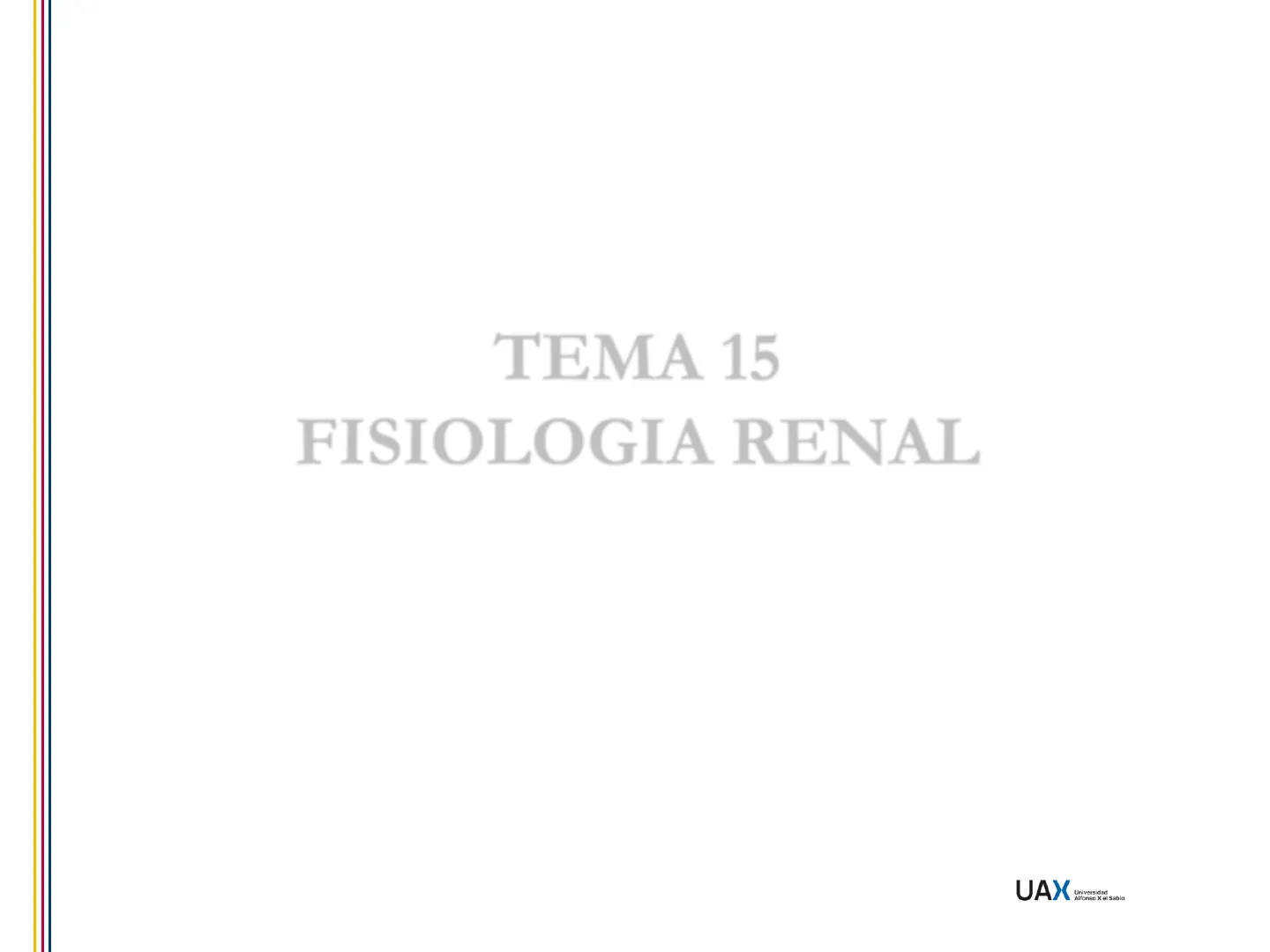 Diapositivas de UAX Universidad Alfonso X el Sabio sobre Fisiología Renal. El Pdf detalla los procesos de filtración, reabsorción y secreción, con un enfoque en la nefrona como unidad funcional. Este material de Biología para Universidad, incluye esquemas y tablas de las funciones de las partes del nefrón y los solutos involucrados.