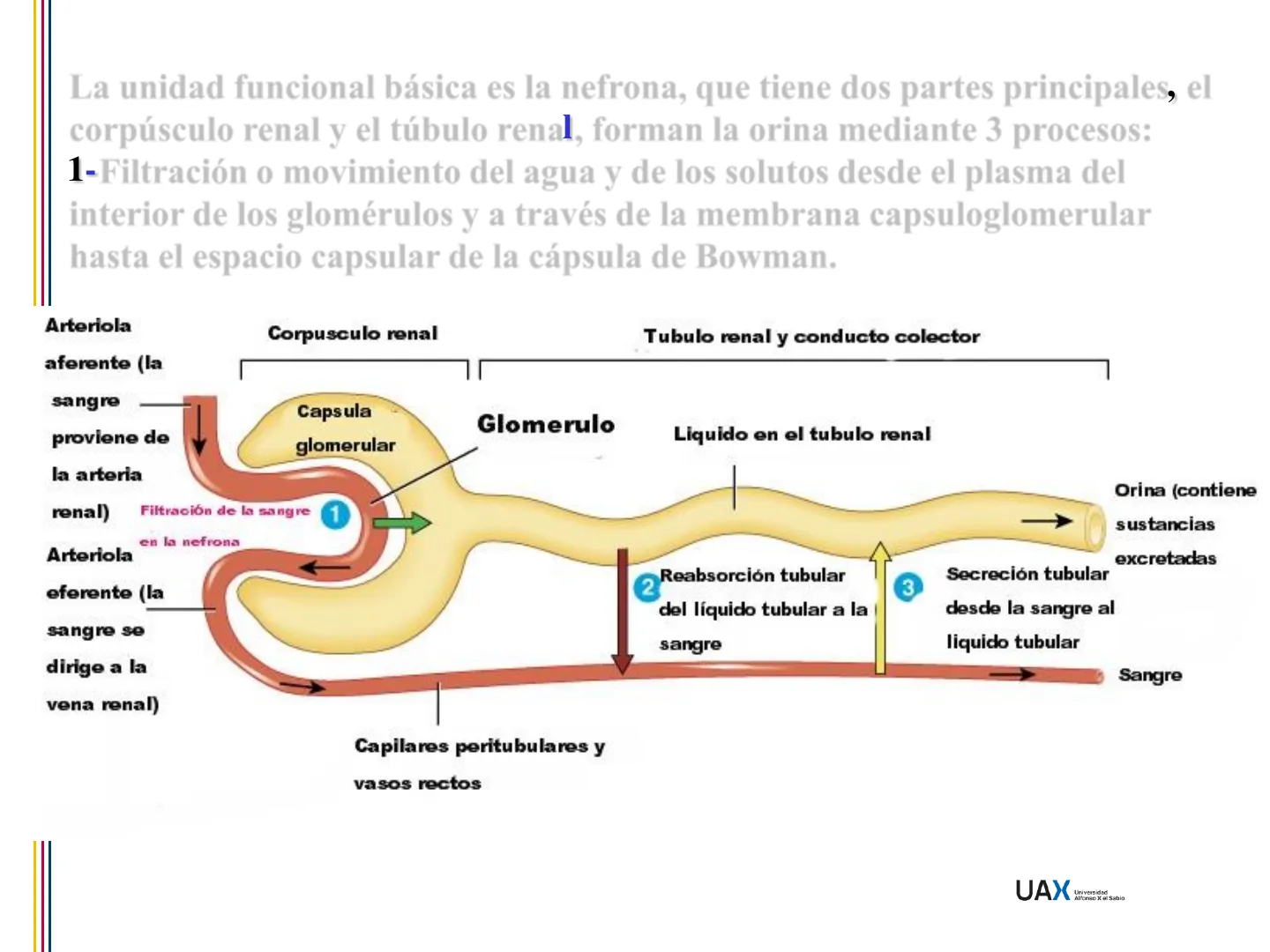 FILTRACION, REABSORCION Y SECRECION 2024/2025 1 UAX Universidad Alfonso X el SabioLa unidad funcional básica es la nefrona, que tiene dos partes principales, el corpúsculo renal y el túbulo renal, forman la orina mediante 3 procesos: