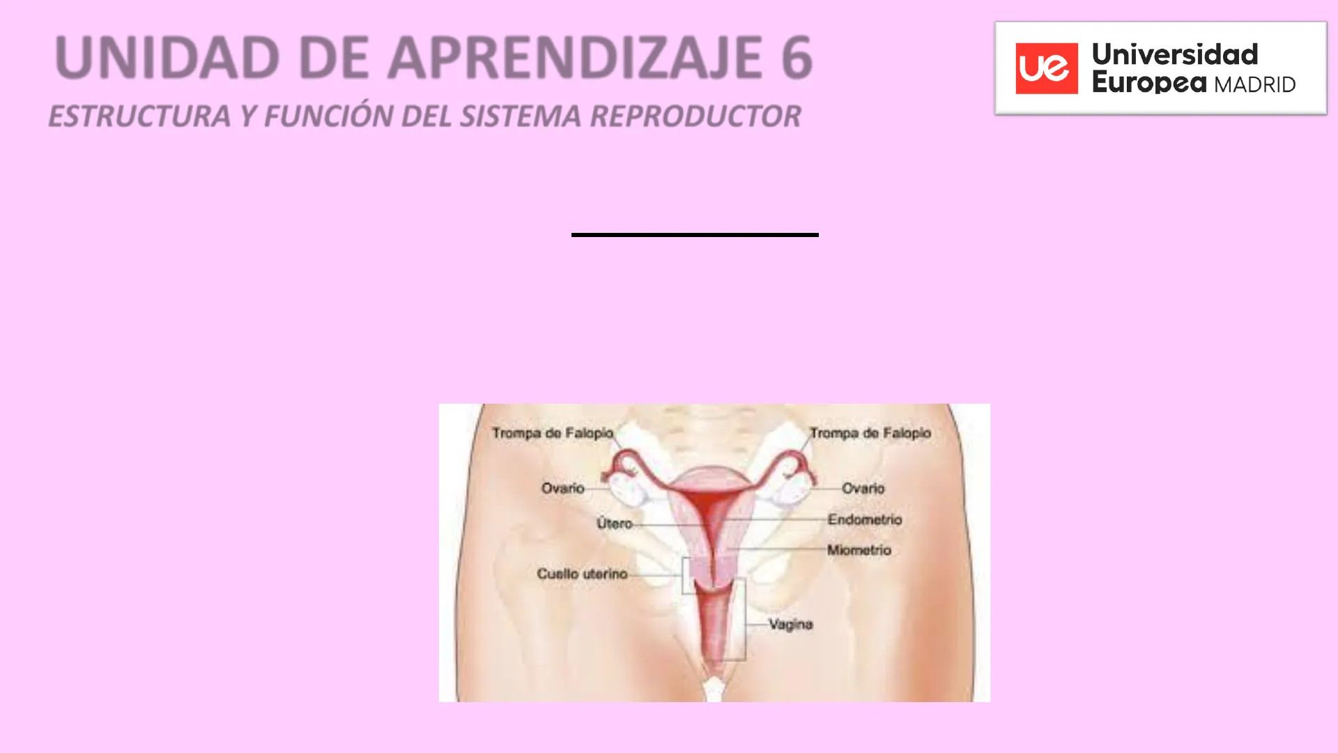 Diapositivas de Universidad Europea Madrid sobre Anatomía e Histología del Aparato Reproductor Femenino. El Pdf, útil para estudiantes universitarios de Biología, detalla las trompas uterinas y el útero, incluyendo sus funciones y características histológicas, con diagramas explicativos y puntos clave para el aprendizaje.