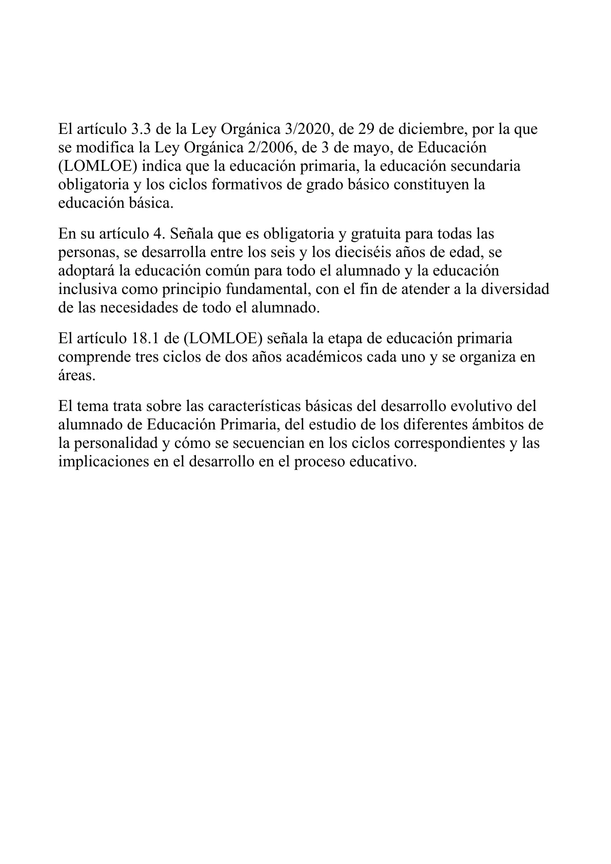 El tema trata sobre las características básicas del desarrollo evolutivo del alumnado de Educación Primaria, del estudio de los diferentes ámbitos de la personalidad y cómo se secuencian en los ciclos correspondientes y las implicaciones en el desarrollo en el proceso educativo.