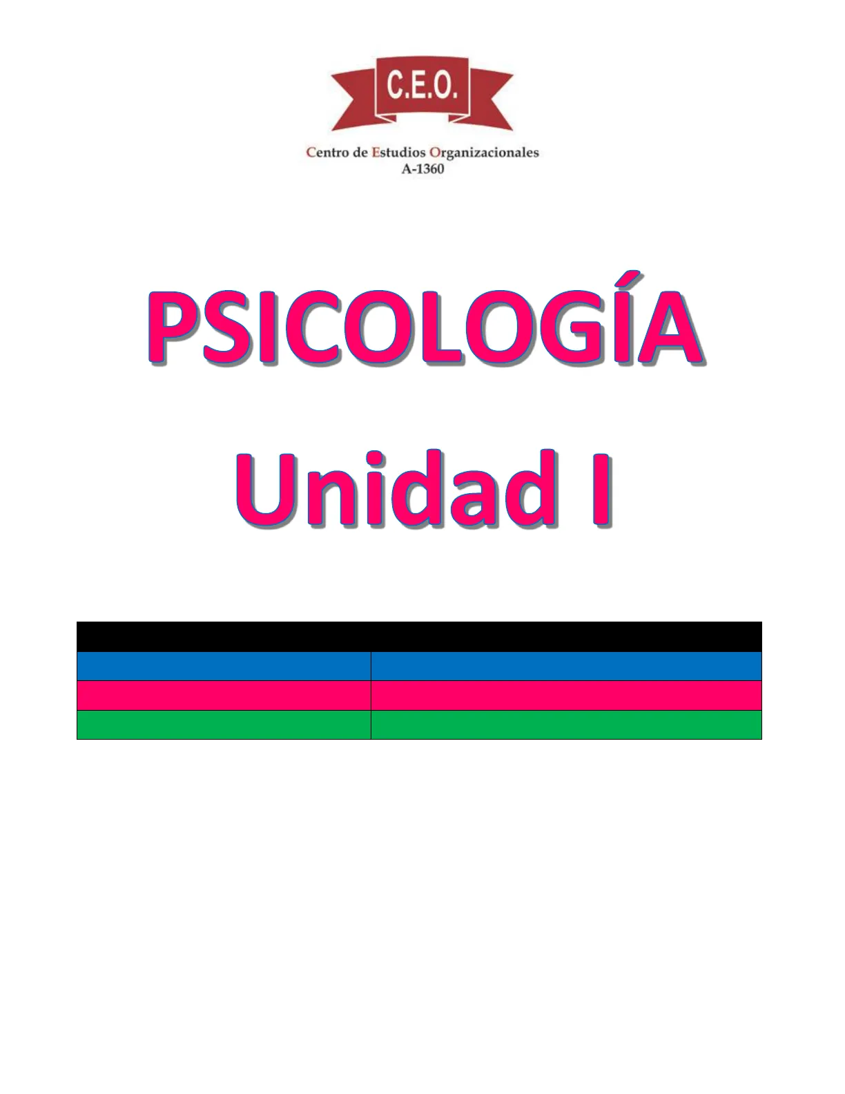 Documento de Centro de Estudios Organizacionales A-1360 sobre Psicología Unidad I. El Pdf, un material digital bien estructurado, aborda la epistemología y los métodos de investigación en psicología, incluyendo los enfoques fenomenológico, introspectivo, psicoanalítico, experimental y clínico, así como las ramas de la psicología básica y aplicada. Es un recurso de nivel universitario para la materia de Psicología.