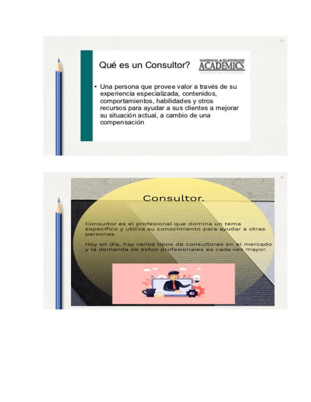 Qué es un Consultor? SANDOVAL & KLEYNHANS ACADEMICS · Una persona que provee valor a través de su experiencia especializada, contenidos, comportamientos, habilidades y otros recursos para ayudar a sus clientes a mejorar su situación actual, a cambio de una compensación 16