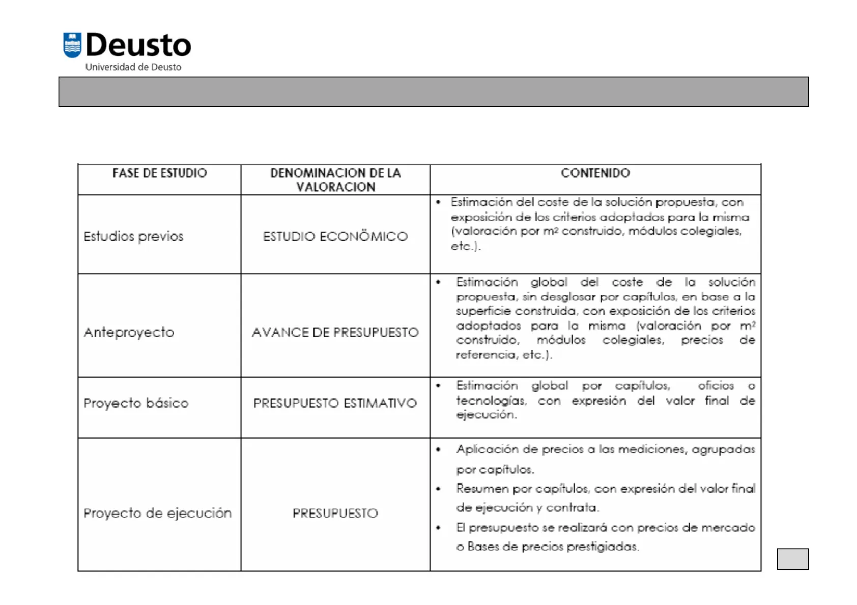 Diapositivas de Deusto Universidad de Deusto sobre El Proyecto: Presupuesto. El Pdf detalla las fases de estimación del presupuesto, desde la fase preliminar hasta la certificación de las obras, incluyendo esquemas de cálculo y tablas explicativas para la comprensión de los procesos financieros en proyectos de Informática a nivel universitario.