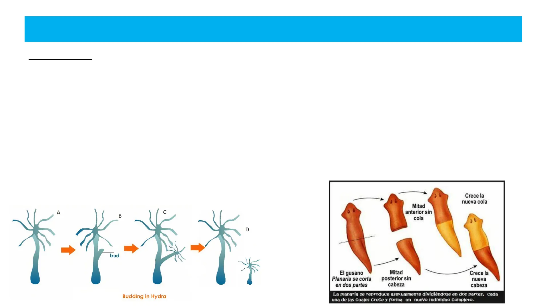 A C B D bud Budding in Hydra Crece la nueva cola Mitad anterior sin cola El gusano Planaria se corta en dos partes Mitad posterior sin cabeza Crece la nueva cabeza La planaria se reproduce asexualmente dividiéndose en dos partes, cada una de las cuales crece y forma un nuevo individuo completo.REPRODUCCIÓN ASEXUAL