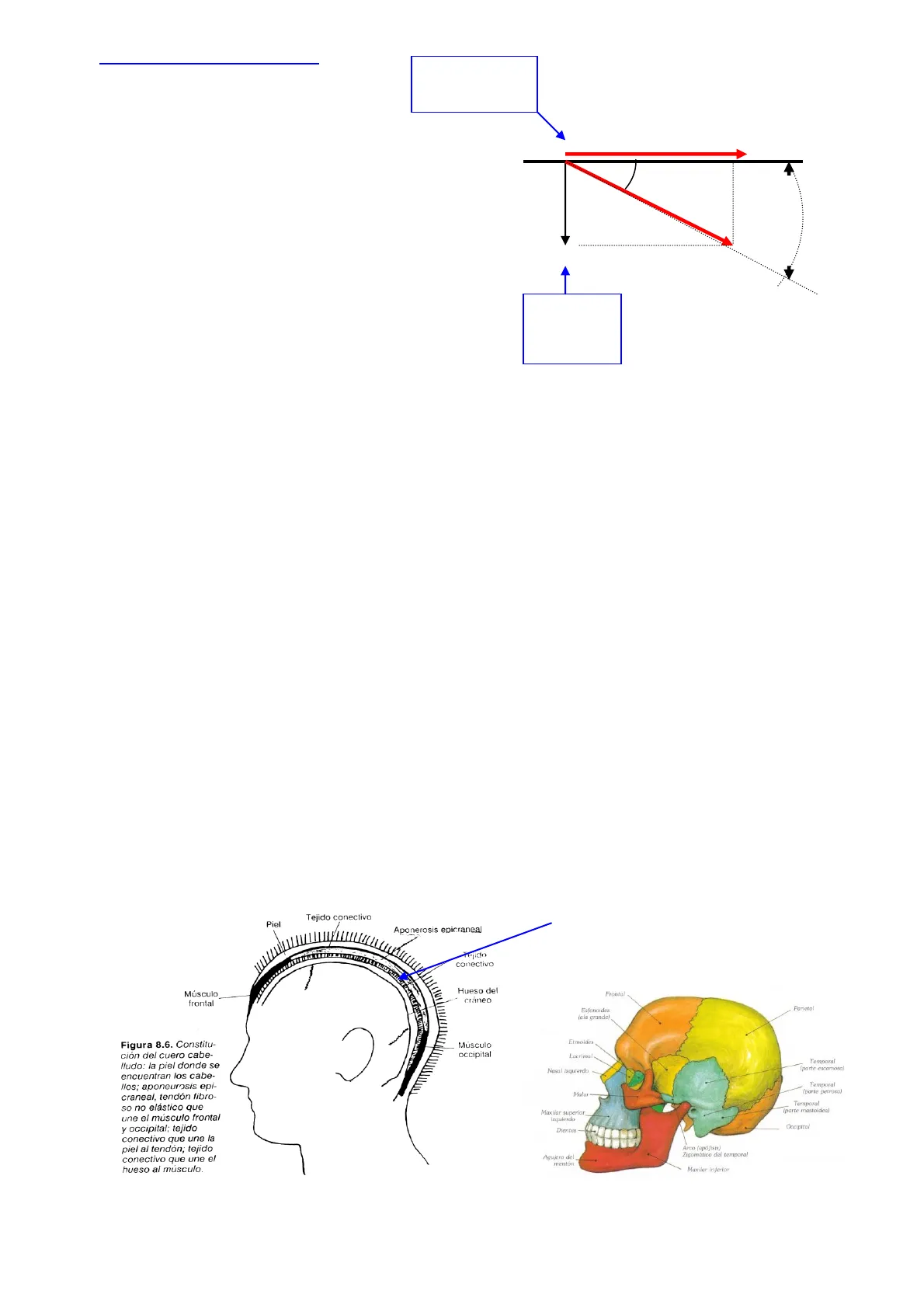 Tejido conectivo Piel Aponerosis epicraneal Tejido conectivo Músculo frontal Hueso del craneo Frontal Parietal Esfenoides (ala grande) Etmoides Lacrimal Temporal (parte escamosa) Nasal izquierdo Temporal (parte petrosa) Malar Temporal (parte mastoidea) Maxilar superior izquierdo Dientes Occipital Arco (apófisis) Zigomático del temporal Agujero del mentón Maxilar inferior Figura 8.6. Constitu- ción del cuero cabe- Iludo: la piel donde se encuentran los cabe- llos; aponeurosis epi- craneal, tendón fibro- so no elástico que une el músculo frontal y occipital; tejido conectivo que une la piel al tendón; tejido conectivo que une el hueso al músculo. Músculo occipital TENDÓN NO ELÁSTICO 2El cuero cabelludo alberga gran cantidad de glándulas sebáceas y sudoríparas y esta recorrido por una gran red nerviosa y vascular. Su espesor varía de unas zonas a otras siendo más grueso en la nuca. El estado del c. cabelludo es vital para la salud del cabello .. Compuesto de 8 huesos y en cuanto a los músculos solo existen en los temporales y en la nuca, en las zonas superiores tiene menor movilidad.