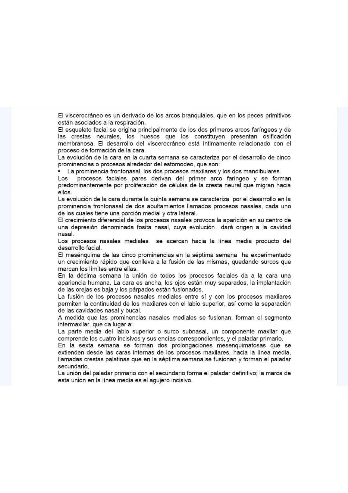 El esqueleto facial se origina principalmente de los dos primeros arcos faríngeos y de las crestas neurales, los huesos que los constituyen presentan osificación membranosa. El desarrollo del viscerocráneo está íntimamente relacionado con el proceso de formación de la cara.