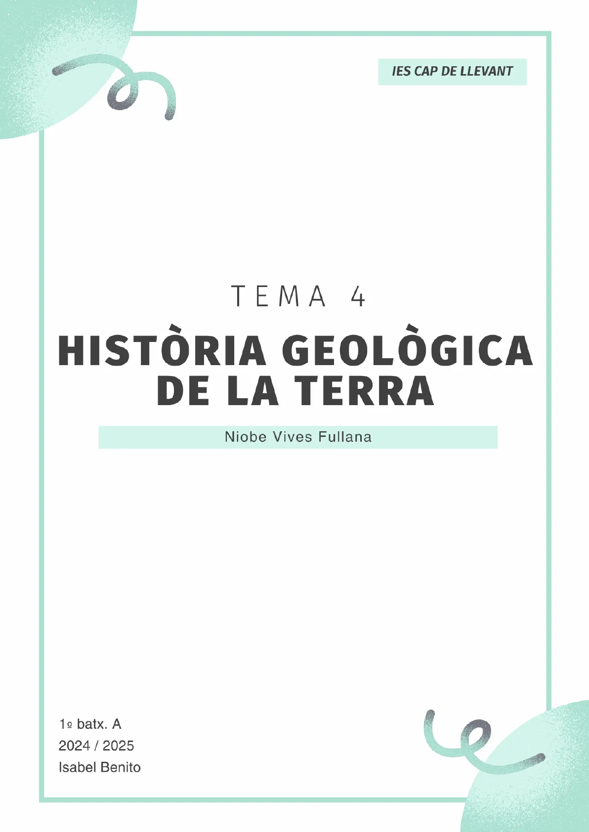Documento de Ies Cap de Llevant sobre la Historia Geológica de la Tierra. El Pdf explora el pasado geológico, el registro estratigráfico y los métodos de datación, con un enfoque en mapas y cortes geológicos. Este material de Ciencias para Bachillerato, con ejemplos visuales, facilita la comprensión de las estructuras subterráneas.
