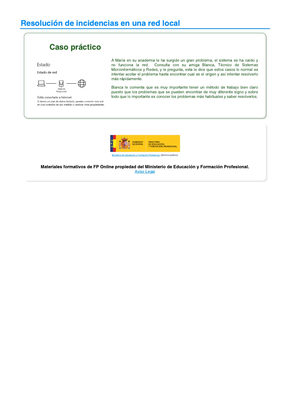 Caso práctico Estado Estado de red Ethernet Red privada Estás conectado a Internet. Si tienes un plan de datos limitado, puedes convertir esta red en una conexión de uso medido o cambiar otras propiedades. A María en su academia le ha surgido un gran problema, el sistema se ha caído y no funciona la red. Consulta con su amiga Blanca, Tecnico de Sistemas Microinformáticos y Redes, y le pregunta, esta le dice que estos casos lo normal es intentar acotar el problema hasta encontrar cual es el origen y así intentar resolverlo más rápidamente. Blanca le comenta que es muy importante tener un método de trabajo bien claro puesto que los problemas que se pueden encontrar de muy diferente signo y sobre todo que lo importante es conocer los problemas más habituales y saber resolverlos.