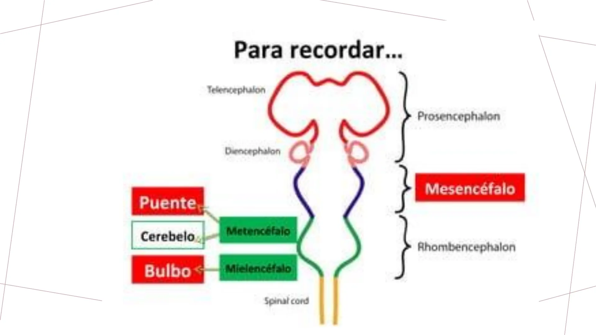TRONCO ENCEFÁLICOPara recordar ... Telencephalon Prosencephalon Diencephalon Mesencéfalo Puente Metencéfalo Cerebelo Rhombencephalon Bulbo Mielencéfalo Spinal cordReúne las estructuras derivadas del rombencéfalo y mesencéfalo Es atravesado por todos los haces ascendentes y descendentes que unen la médula espinal con el prosencéfalo Es el lugar donde se encuentran los núcleos de 10 de los 12 pares craneales. Las lesiones del tronco encefálico suelen afectar a estos nervios craneales· Formado por el bulbo raquídeo, la protuberancia y el mesencéfalo. · Ventralmente está unido al cerebelo por los pedúnculos superior, medio e inferior. Está compuesto tanto por partes de sustancia blanca como por algunas zonas en las que predomina la materia gris, lo cual significa que la recorren tanto áreas de conexión como zonas en las que los cuerpos de las neuronas se concentran formando núcleos de control.