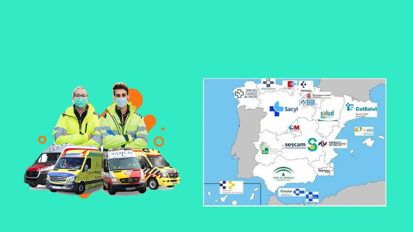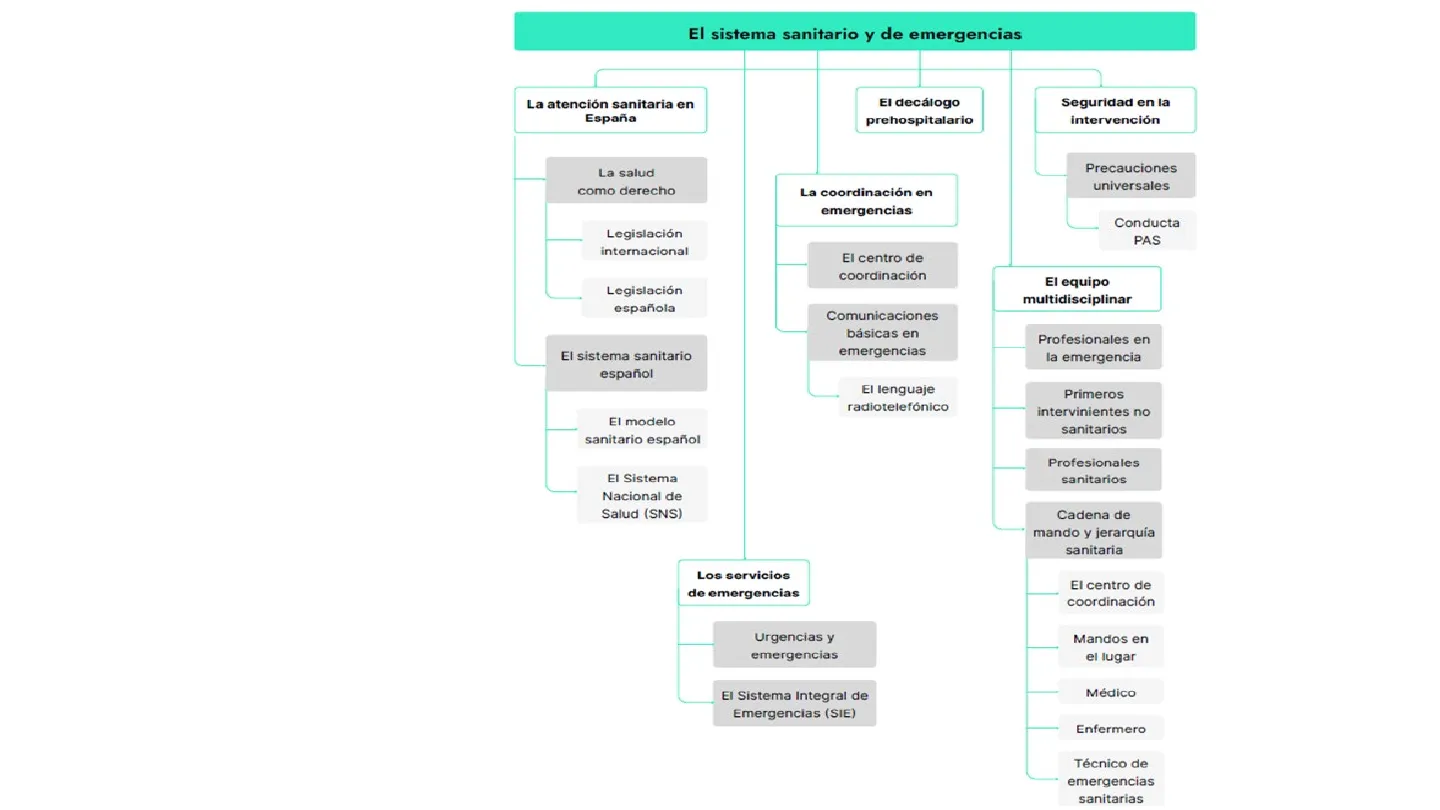 C Osakidetza SERVIZO GALEGO de SAUDE Salud is CatSalut Sacyl salud Sarvel CuiNik > ib-salut sescam VALENCIANA OF LALUT AMBULANCIA ASISTENCIAL SAMUR PROTECCION CINUS SFS Murciano O AINAJUBMA w12-,-Emerge Q. Sanitarie JUNIA DE MEDALUCIN O Ceuta Melilla SvEl sistema sanitario y de emergencias La atención sanitaria en España El decálogo prehospitalario Seguridad en la intervención La salud como derecho Precauciones universales La coordinación en emergencias Conducta PAS Legislación internacional El centro de coordinación El equipo multidisciplinar Legislación española Comunicaciones básicas en emergencias Profesionales en la emergencia El sistema sanitario español El lenguaje radiotelefónico Primeros intervinientes no sanitarios El modelo sanitario español Profesionales sanitarios El Sistema Nacional de Salud (SNS) Cadena de mando y jerarquía sanitaria El centro de coordinación Mandos en el lugar Médico Enfermero Técnico de emergencias sanitarias Mapa Conceptual Los servicios de emergencias Urgencias y emergencias El Sistema Integral de Emergencias (SIE)1