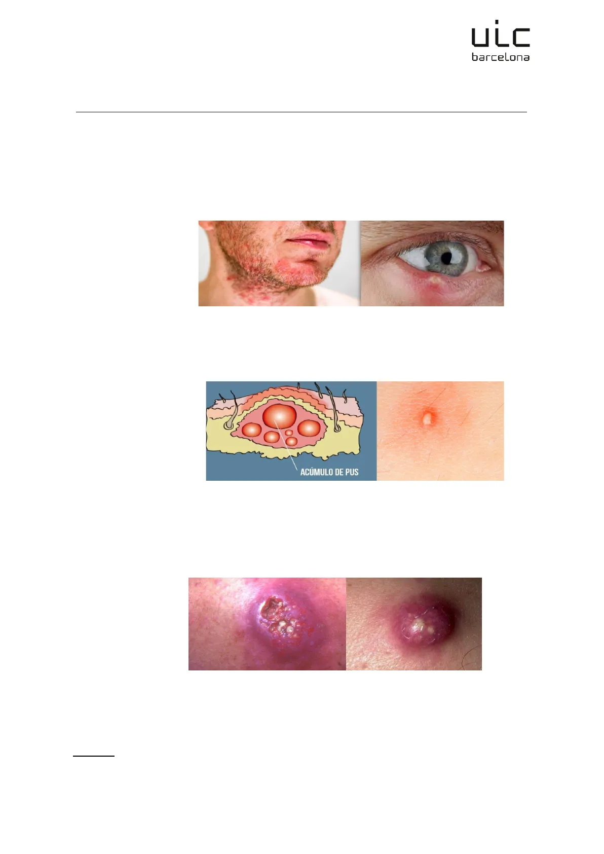 ULC barcelona DERMATOLOGÍA 1ULC barcelona DERMATOLOGÍA CLÍNICA Foliculitis: Infección estafilocócica por Staphylococcus aureus en los folículos pilosos, es frecuente en zonas que se rasuran (barba, piernas, axilas): PIODERMITIS (alteración cutánea + pus). Orzuelo: Es una foliculitis de las pestañas, producida por S. AUREUS. Se manifiesta como una lesión única, inflamatoria, con edema palpebral y una pústula en su superficie. Si la foliculitis avanza y no se supera, nos encontramos con un Forúnculo: Inflamación aguda de uno o varios folículos, que surge en capas profundas y se disemina a la dermis circundante, la furunculosis es la aparición de forúnculos múltiples y recurrentes.