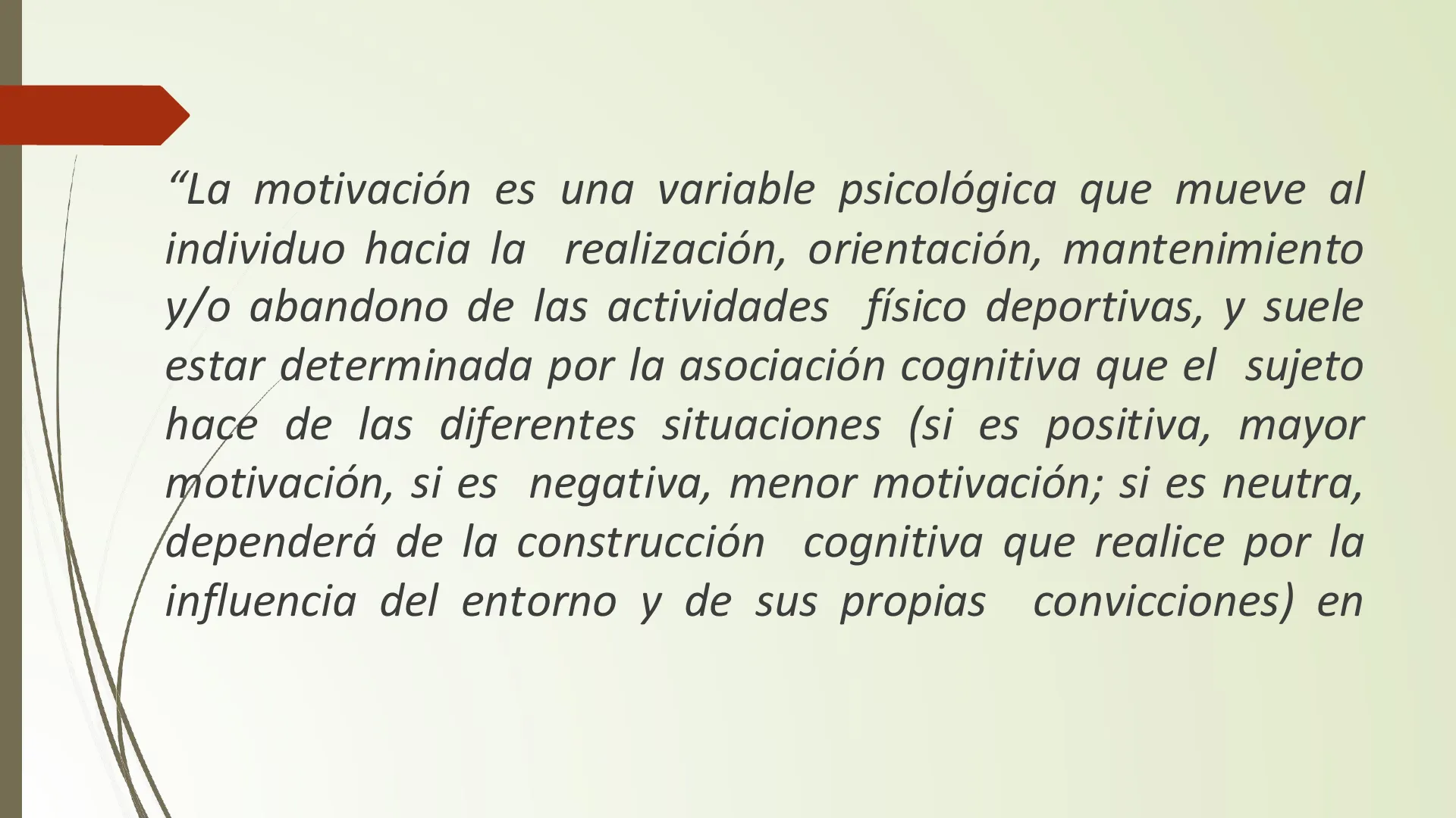 TEMA 2 LA MOTIVACIÓN EN EL DEPORTE PSICOLOGÍA DE LA ACTIVIDAD FÍSICA Y DE LA COMPETICIÓN DOCENTE: NOEMÍ JIMÉNEZ GONZÁLEZ"La motivación es una variable psicológica que mueve al individuo hacia la realización, orientación, mantenimiento y/o abandono de las actividades físico deportivas, y suele estar determinada por la asociación cognitiva que el sujeto haçe de las diferentes situaciones (si es positiva, mayor motivación, si es negativa, menor motivación; si es neutra, dependerá de la construcción cognitiva que realice por la influencia del entorno y de sus propias convicciones) en función de una serie de factores (individuales, sociales, ambientales y culturales).