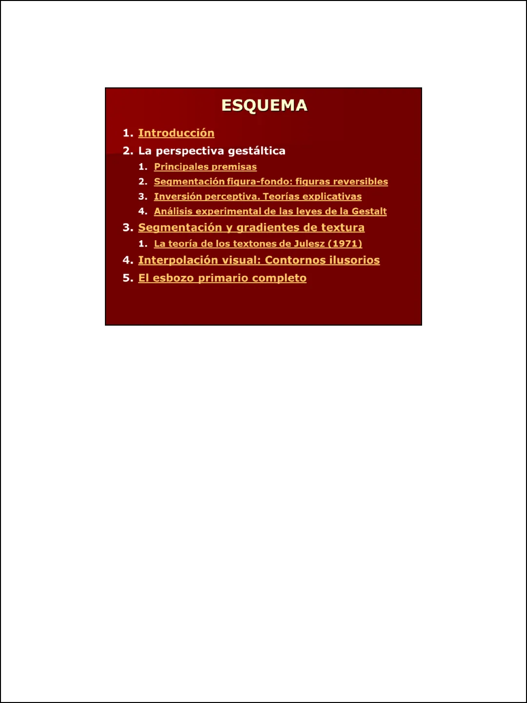 1ESQUEMA 1. Introducción 2. La perspectiva gestáltica 1. Principales premisas 2. Segmentación figura-fondo: figuras reversibles 3. Inversión perceptiva. Teorías explicativas 4. Análisis experimental de las leyes de la Gestalt 3. Segmentación y gradientes de textura 1. La teoría de los textones de Julesz (1971) 4. Interpolación visual: Contornos ilusorios 5. El esbozo primario completo
