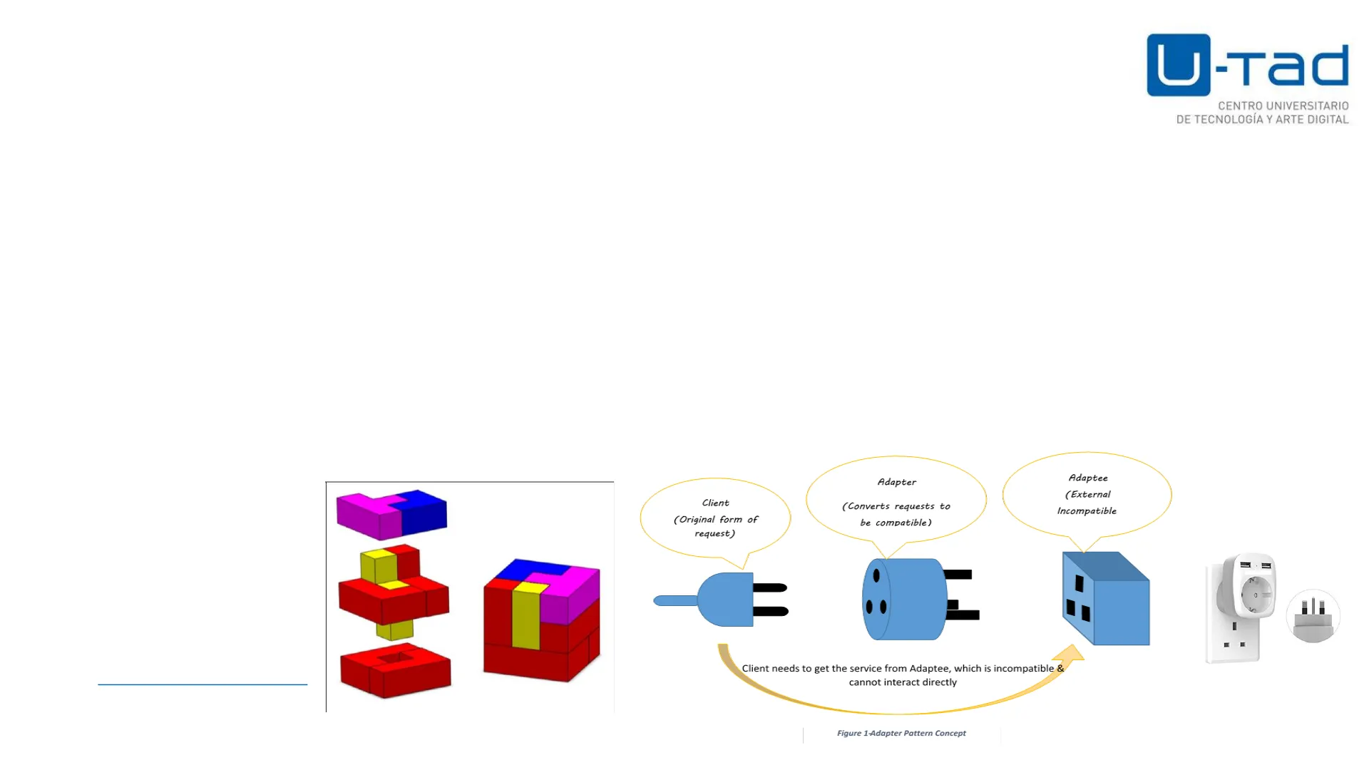Adapter (Converts requests to be compatible) Adaptee (External Incompatible Client (Original form of request ) I Fuente: https://images.google.es/ Client needs to get the service from Adaptee, which is incompatible & cannot interact directly Figure 1-Adapter Pattern ConceptDiseño de software - Patrón Adapter U -Tad CENTRO UNIVERSITARIO DE TECNOLOGÍA Y ARTE DIGITAL
