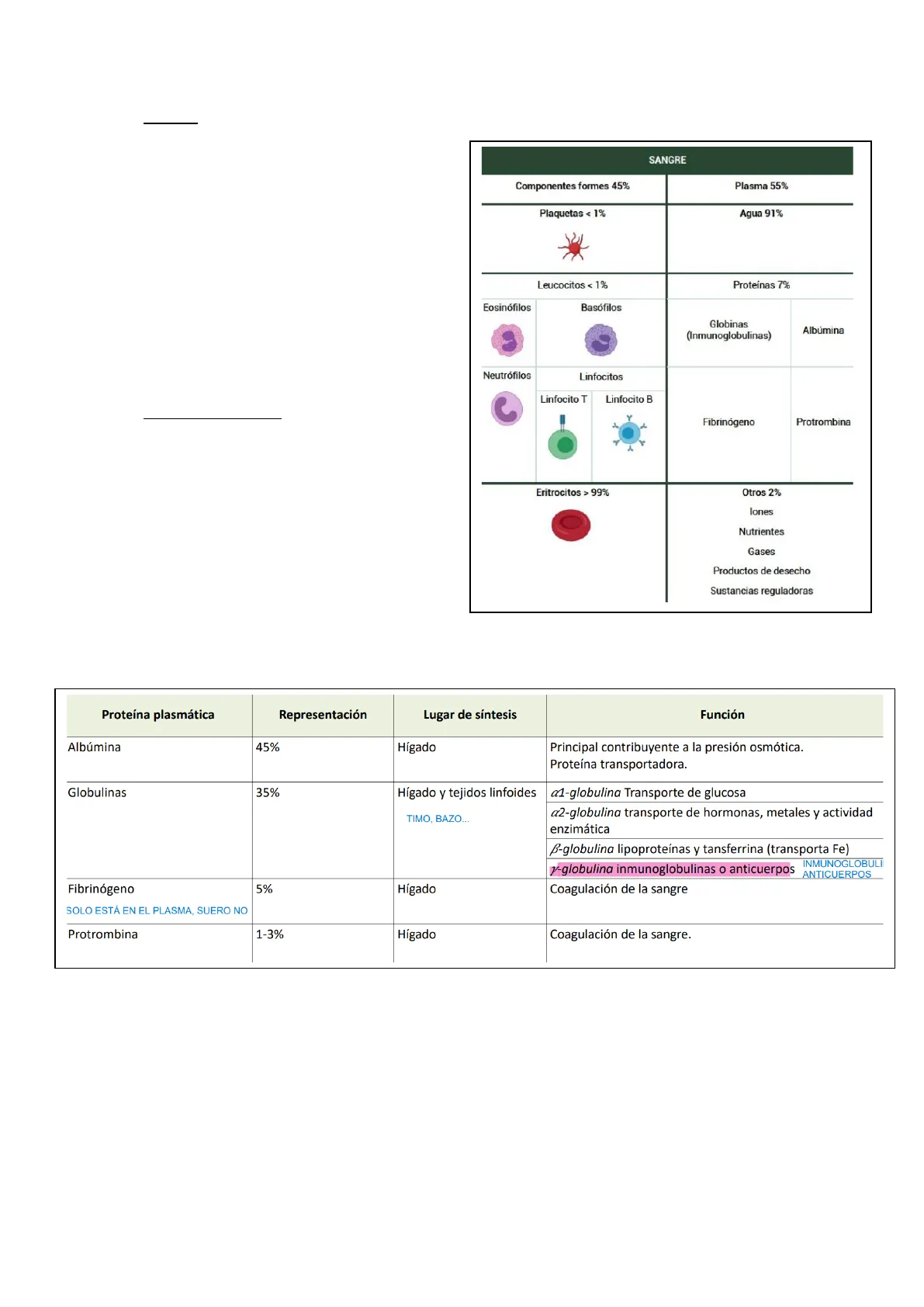 Proteína plasmática Representación Lugar de síntesis Función Albúmina 45% Hígado Principal contribuyente a la presión osmótica. Proteína transportadora. Globulinas 35% Hígado y tejidos linfoides TIMO, BAZO ... a1-globulina Transporte de glucosa @2-globulina transporte de hormonas, metales y actividad enzimática ß-globulina lipoproteínas y tansferrina (transporta Fe) INMUNOGLOBULII y-globulina inmunoglobulinas o anticuerpos ANTICUERPOS Fibrinógeno SOLO ESTÁ EN EL PLASMA, SUERO NO 5% Hígado Coagulación de la sangre Protrombina 1-3% Hígado Coagulación de la sangre. La proteína más abundante es la albúmina, seguida de las globulinas, el fibrinogeno y la protombina.