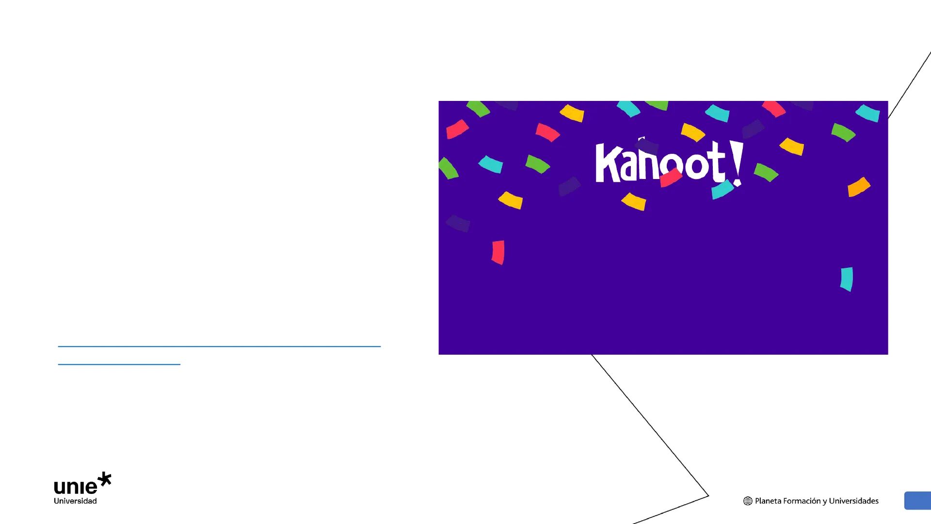 EVALUACIÓN POR COMPETENCIAS https://create.kahoot.it/share/kahoot-ua2- parte-1-de-aprendizaje-de-la- materia/5b8802ac-3144-4eaf-ab84- 280f27b6e749 unie Universidad Planeta Formación y Universidades1.
