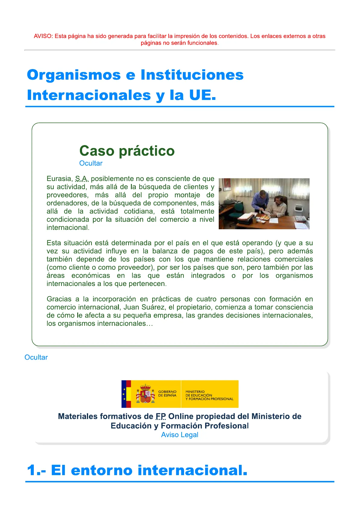 Documento del Ministerio de Educación y Formación Profesional sobre Organismos e Instituciones Internacionales y la UE. El Pdf, de Formación profesional en Economía, explora el papel de los organismos internacionales, la globalización y la eurozona, incluyendo casos prácticos y autoevaluaciones para verificar la comprensión de los temas tratados.