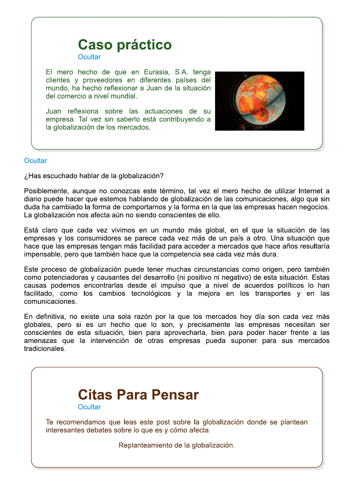 Ocultar El mero hecho de que en Eurasia, S.A. tenga clientes y proveedores en diferentes países del mundo, ha hecho reflexionar a Juan de la situación del comercio a nivel mundial.