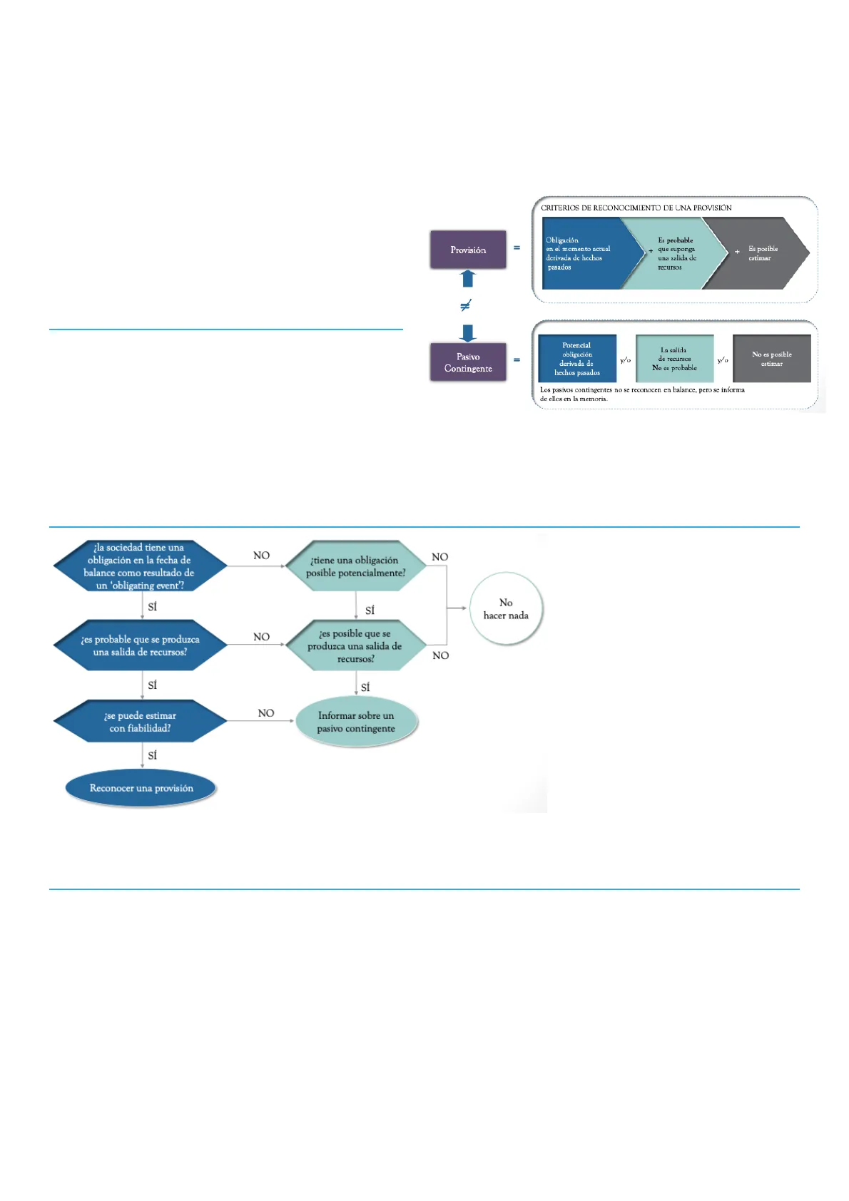 ¿la sociedad tiene una obligación en la fecha de balance como resultado de un 'obligating event'? NO NO ¿tiene una obligación posible potencialmente? SÍ Sİ No hacer nada ¿es probable que se produzca una salida de recursos? NO ¿es posible que se produzca una salida de recursos? NO SÍ SÍ NO ¿se puede estimar con fiabilidad? Informar sobre un pasivo contingente SÍ Reconocer una provisión