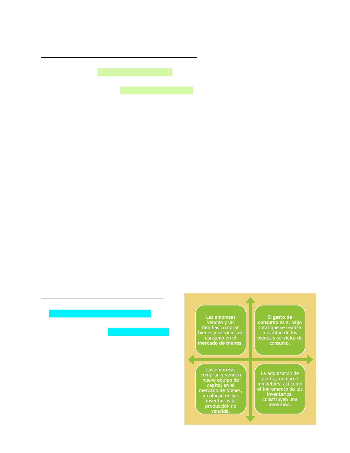 El dinero siempre estará fluyendo pq todos los actores ganan y gastan el dinero, es un flujo circular pq es un neverending story. Las empresas venden y las familias compran bienes y servicios de consumo en el mercado de bienes. El gasto de consumo es el pago total que se realiza a cambio de los bienes y servicios de consumo. Las empresas compran y venden nuevo equipo de capital en el mercado de bienes, y colocan en sus inventarios la producción no vendida. La adquisición de planta, equipo e inmuebles, así como el incremento de los inventarios, constituyen una inversión.