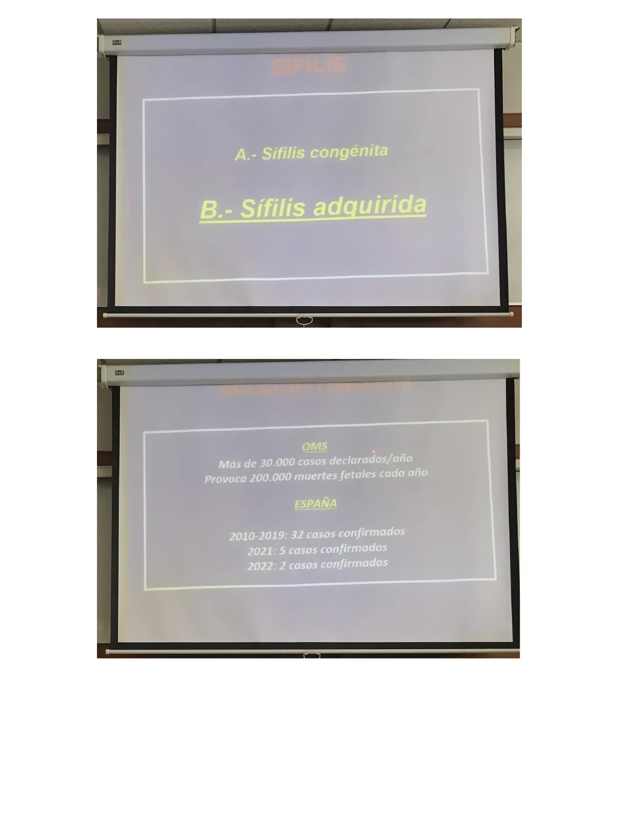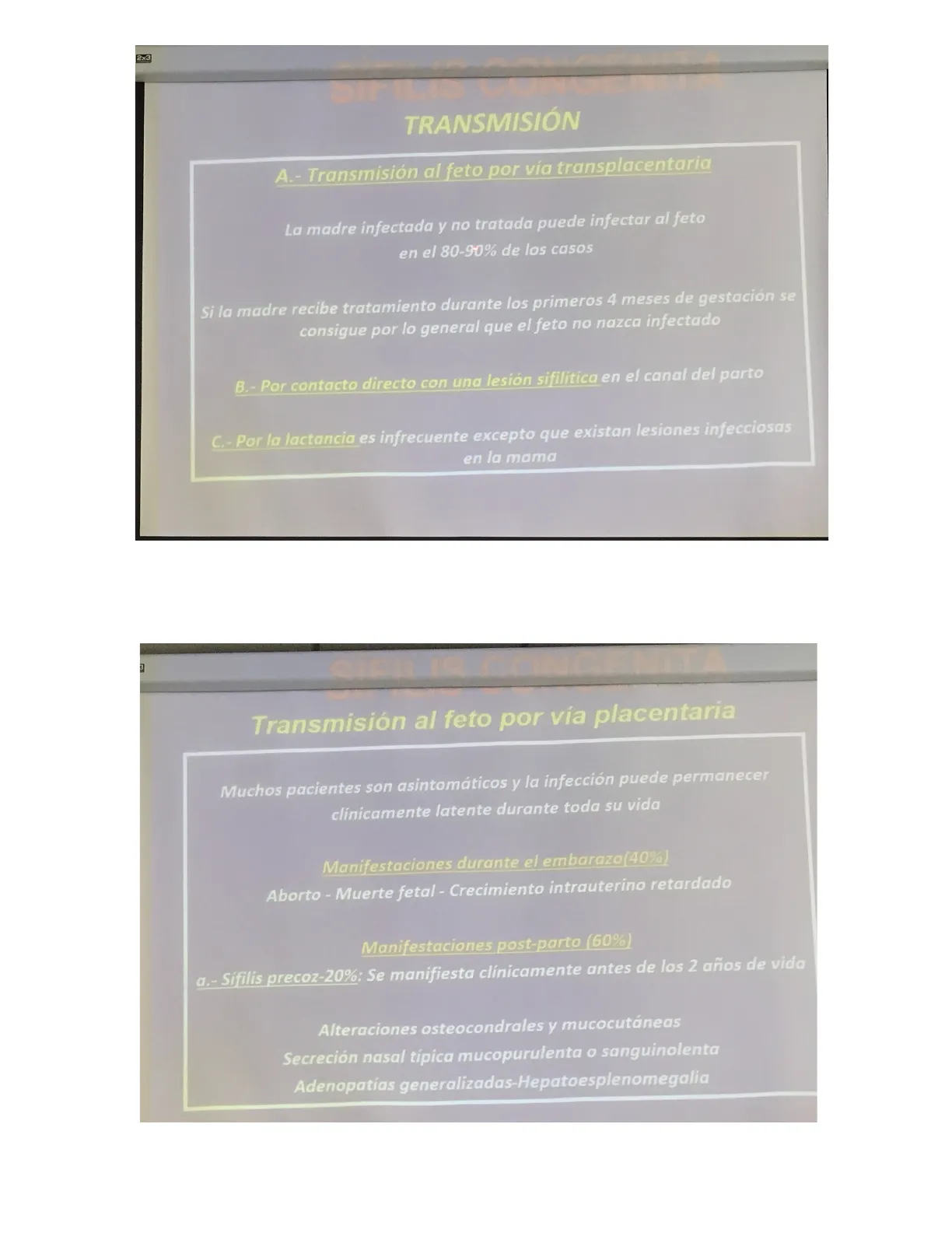 Diapositivas sobre Sífilis. El Pdf detalla la sífilis, distinguiendo entre formas congénitas y adquiridas, con datos epidemiológicos y manifestaciones clínicas. La presentación, útil para Biología a nivel universitario, incluye imágenes de chancros sifilíticos y aborda la transmisión al feto y post-parto.