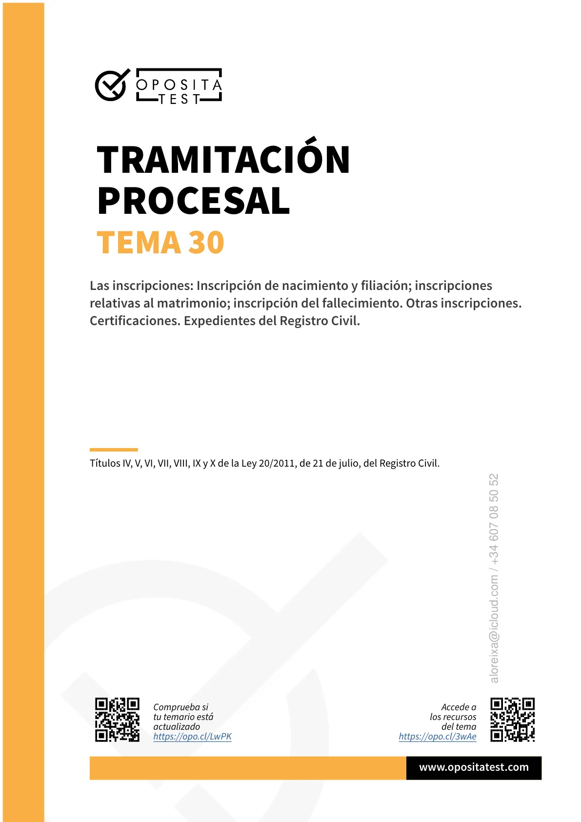 Documento de Oposita Test sobre Tramitación Procesal Tema 30. El Pdf, un material de Derecho para Oposiciones, detalla las inscripciones en el Registro Civil, como nacimientos, filiación, matrimonios y defunciones, basándose en la Ley 20/2011 y procedimientos para matrimonios civiles y religiosos.