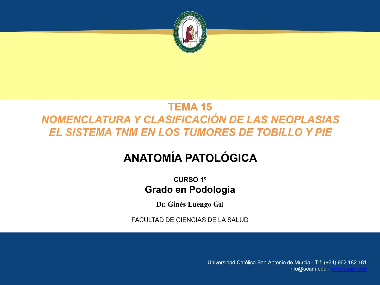 Diapositivas de Universidad Católica San Antonio de Murcia sobre nomenclatura y clasificación de las neoplasias, sistema TNM en tumores de tobillo y pie. El Pdf explora las clasificaciones biológicas de tumores y el concepto de ganglio centinela, incluyendo un gráfico de supervivencia para melanoma en estadio III, útil para estudiantes universitarios de Biología.