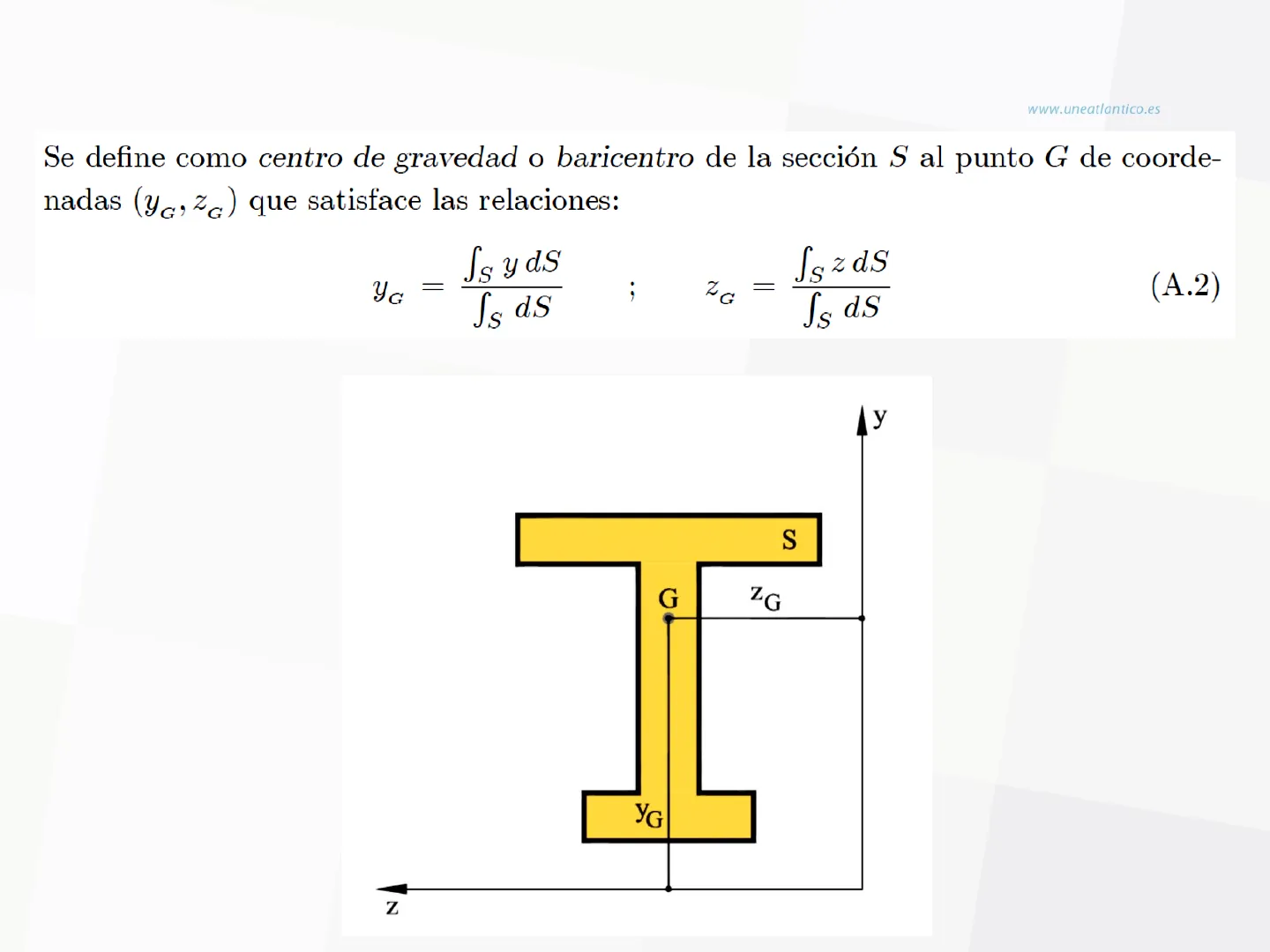 www.uneatlantico.es Se define como centro de gravedad o baricentro de la sección S al punto G de coorde- nadas (yg, zg) que satisface las relaciones: yG = Js dS Ss y ds Ssz dS ; = Ss ds (A.2) y S G ZG YG Z
