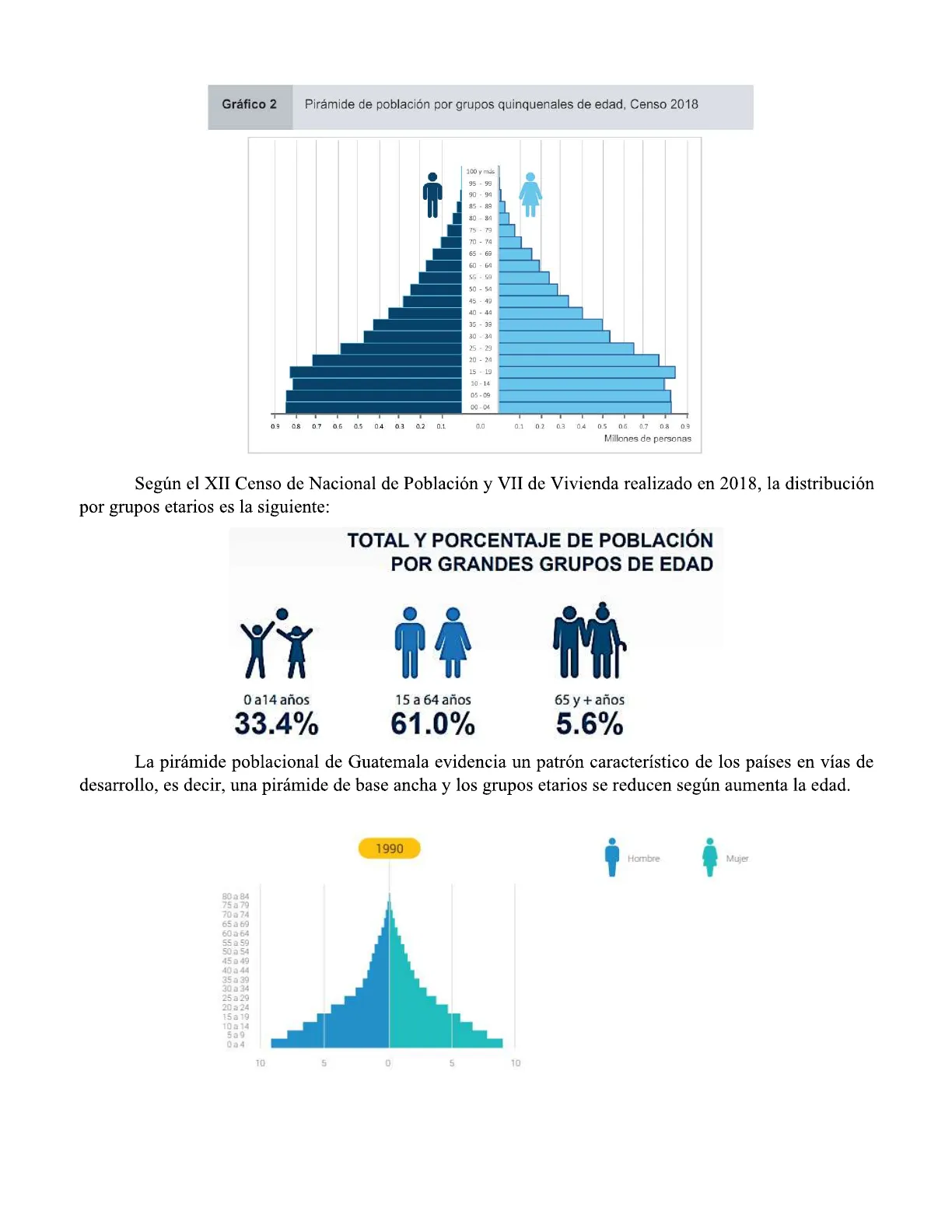 La pirámide poblacional de Guatemala evidencia un patrón característico de los países en vías de desarrollo, es decir, una pirámide de base ancha y los grupos etarios se reducen según aumenta la edad. 1990 Hombre Mujer 80 a 84 75 à 79 70 a 74 65 à 69 60 a 64 55 a 59 50 a 54 45 a 49 40 a 44 35 a 39 30.a 34 25 a 29 20 a 24 15 a 19 10 a 14 5a9 0a4 TO 5 0 5 102020 2050 80 a 84 80 a 84 75 a 79 75 a 79 70 a. 74 70 a 74 65 a 69 65 a 69 60 a 64 60 a 64 55 a 59 55 a 59 50 a 54 50 a 54 45 a 49 45 a 49 40 a 44 40 a 44 35 a 39 35 a 39 30 a 34 30 à 34 25 a 29 25 a 29 20 a 24 20 a 24 15a 19 15 a 19 10 a 14 10 a 14 5a9 0a4 004 10 5 0 5 10 10 5 0 5 10