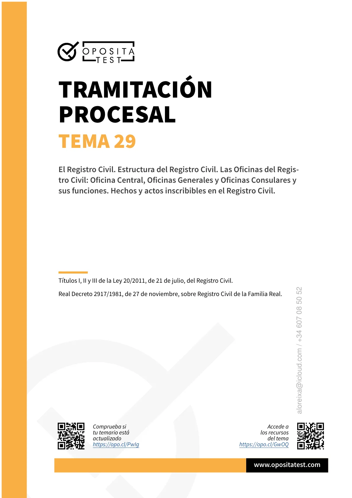 Documento de Oposita Test sobre Tramitación Procesal Tema 29. El Pdf es un material didáctico para oposiciones de Derecho, centrado en el Registro Civil español, sus oficinas y actos inscribibles. Incluye secciones sobre la Dirección General de Seguridad Jurídica y el Registro Civil de la Familia Real.