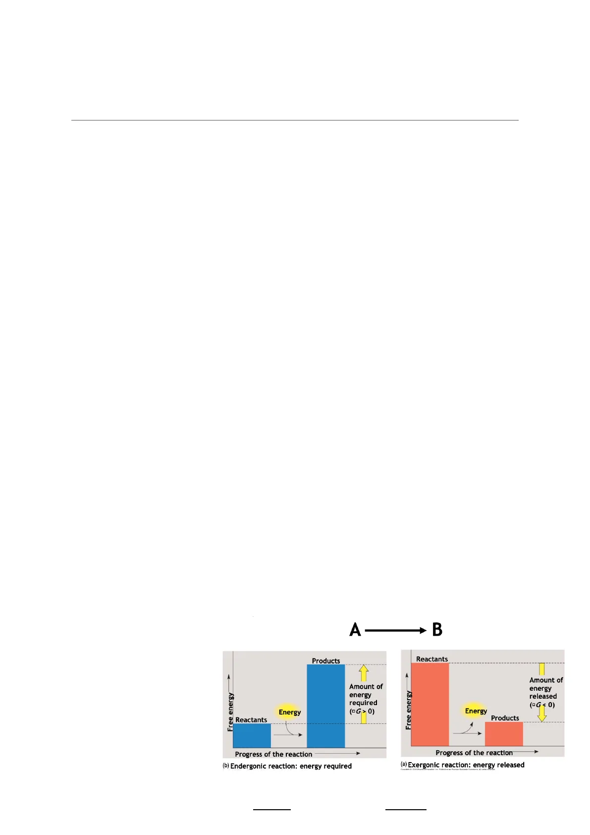 A - - B Products 1 Free energy Amount of energy required ("G> 0) Energy Reactants Progress of the reaction (b) Endergonic reaction: energy required Reactants I 4 Amount of energy released (PG < 0) Free energy Energy Products Progress of the reaction (a) Exergonic reaction: energy released Comvista &: 2006, Pearson Freatine Ine. Publicina an Pearson Rartierin Camminns Ad ditets satablet Se mide según la energía libre de gibbs: Si es positiva endergónica, si es negativa exergónica.