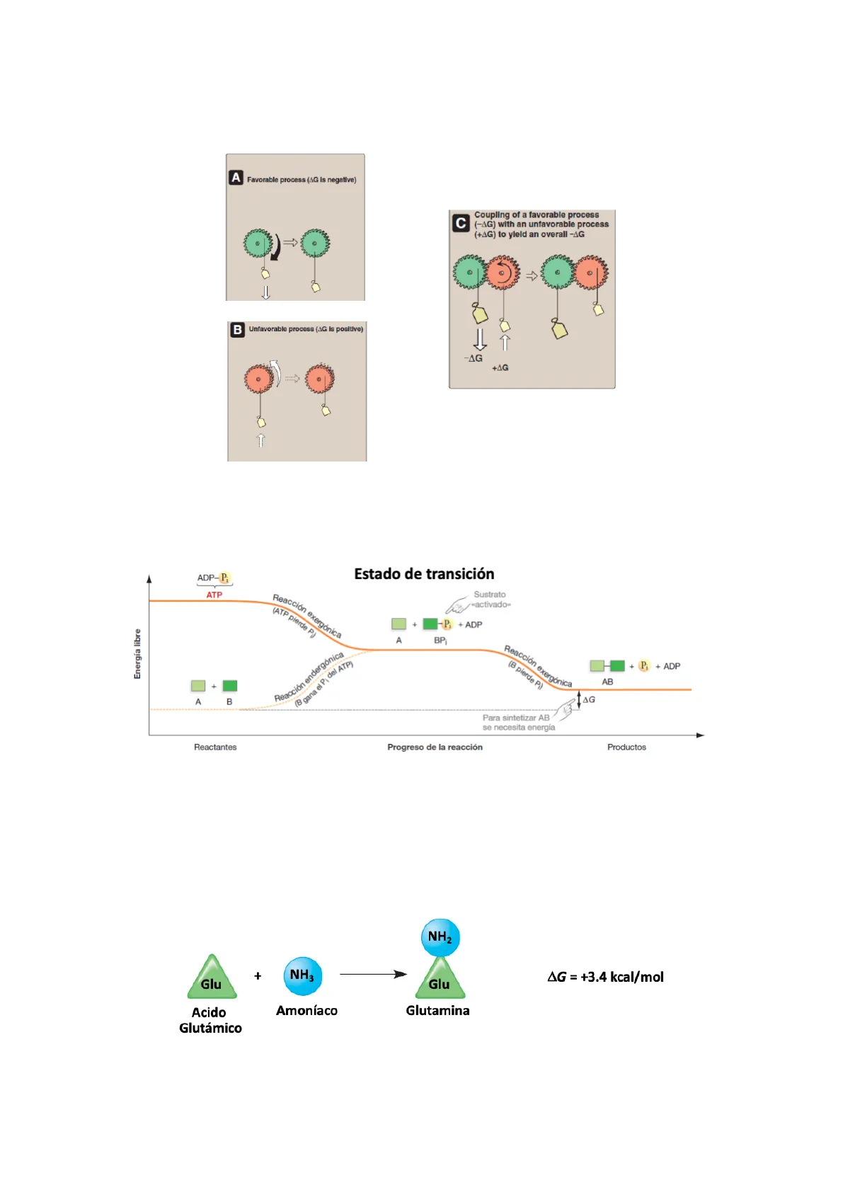 1Acoplar dos reacciones -> aprovecho la energía que me da una para realizar la siguiente A Favorable process (AG is negative) C Coupling of a favorable process (-AG) with an unfavorable process (+AG) to yield an overall -AG B Unfavorable process (AG Is positive) -AG +AG Aprovechamos la energía que libera una reacción exergónica (-) para realizar una reacción endergónica (+).