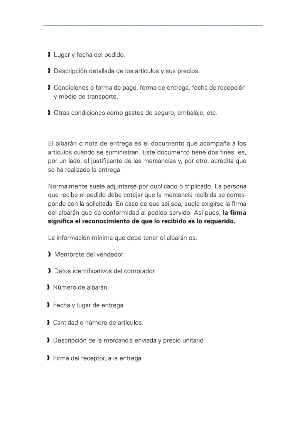 El albarán o nota de entrega es el documento que acompaña a los artículos cuando se suministran. Este documento tiene dos fines: es, por un lado, el justificante de las mercancías y, por otro, acredita que se ha realizado la entrega. Normalmente suele adjuntarse por duplicado o triplicado. La persona que recibe el pedido debe cotejar que la mercancía recibida se corres- ponde con la solicitada. En caso de que así sea, suele exigirse la firma del albarán que da conformidad al pedido servido. Así pues, la firma significa el reconocimiento de que lo recibido es lo requerido. La información mínima que debe tener el albarán es: