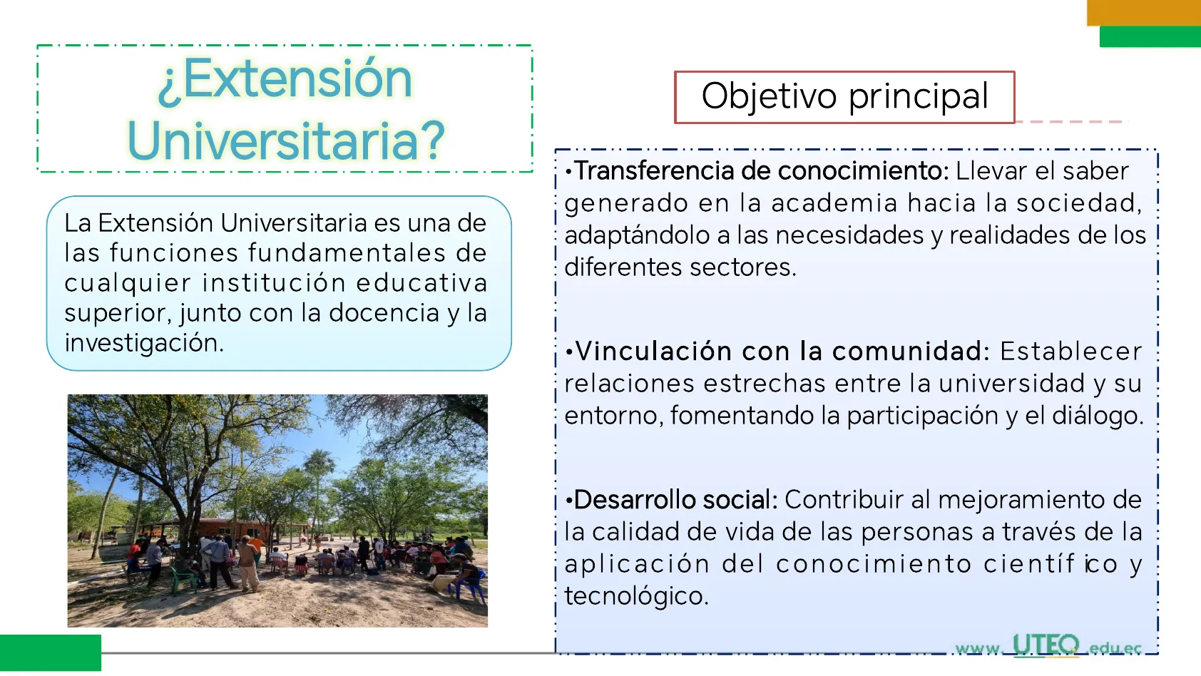 Diapositivas de Uteq sobre los orígenes y evolución de la extensión universitaria. El Pdf explora los antecedentes y las primeras experiencias de esta función académica, definiendo sus objetivos principales y características distintivas para estudiantes universitarios.