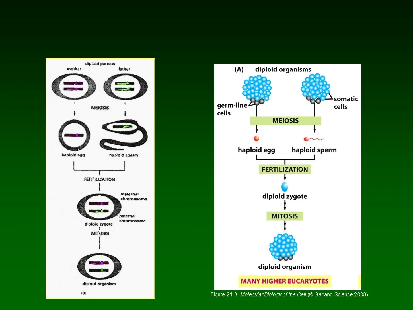 diploid parents mother father MEIOSIS haploid ogp haploid sporm FERTILIZATION - maternal chromosome paternal chromosome diploid zygote . MITOSIS digloid organism (3) (A) diploid organisms somatic cells germ-line cells MEIOSIS - haploid egg haploid sperm FERTILIZATION diploid zygote MITOSIS diploid organism MANY HIGHER EUCARYOTES Figure 21-3 Molecular Biology of the Cell (@ Garland Science 2008)
