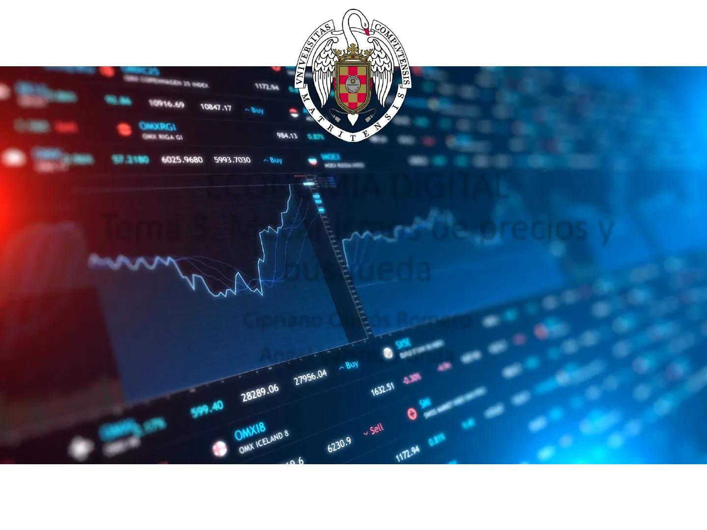 VNIVERSITAS COMPLVTENSIS 1172.54 10916.69 10847.17 ~ Buy A OMAXRGI GINA RIGA GI 984.13 TRI EN T 6025.9680 5993.7030 ~ Buy ECONOMÍA DIGITAL Tema 3. Mecanismos de precios y búsqueda Cipriano Quirós Romero Angel Valarezo Unda ~ Buy 27956.04 -0.30% 28289.06 1632.51 599.40 + OMX18 v Sell OMX ICELAND 8 6230.9 1172.94 0 6 Grado en Ciencia de los Datos Aplicada 1 SISEconomía digital
