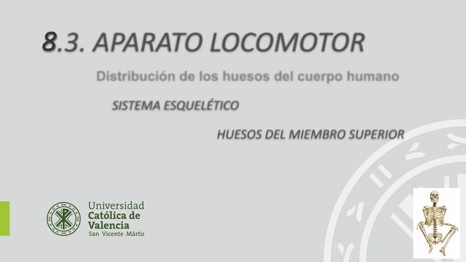 Diapositivas de Universidad Católica de Valencia San Vicente Mártir sobre Aparato Locomotor. El Pdf detalla la anatomía del aparato locomotor, incluyendo la distribución de los huesos y el sistema esquelético, con un enfoque en el miembro superior. Este material de Biología para Universidad, presenta esquemas detallados de las estructuras óseas, facilitando el estudio autónomo.