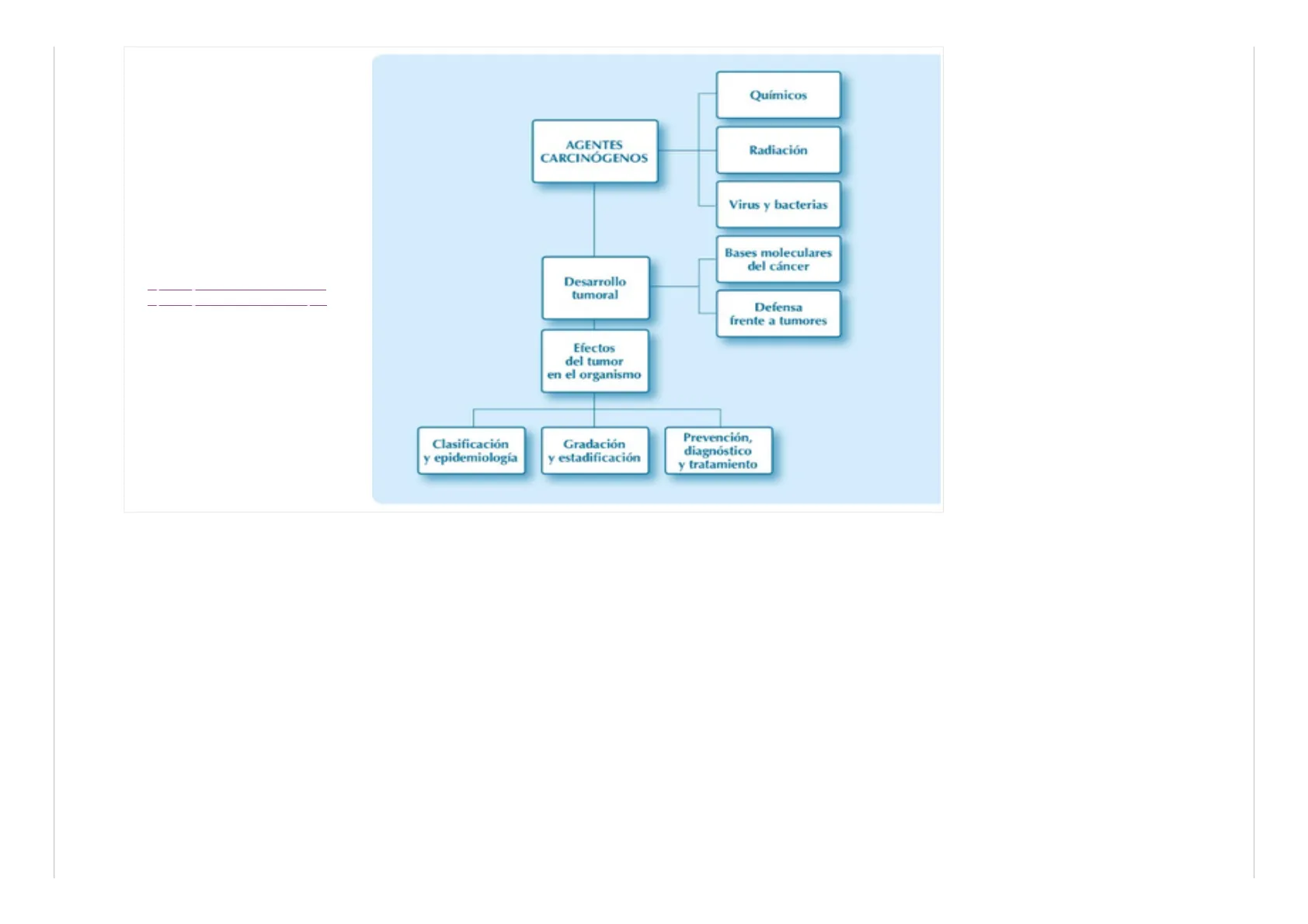 Bases moleculares del cáncer Desarrollo tumoral Defensa frente a tumores Efectos del tumor en el organismo Clasificación y epidemiología Gradación y estadificación Prevención, diagnóstico y tratamiento