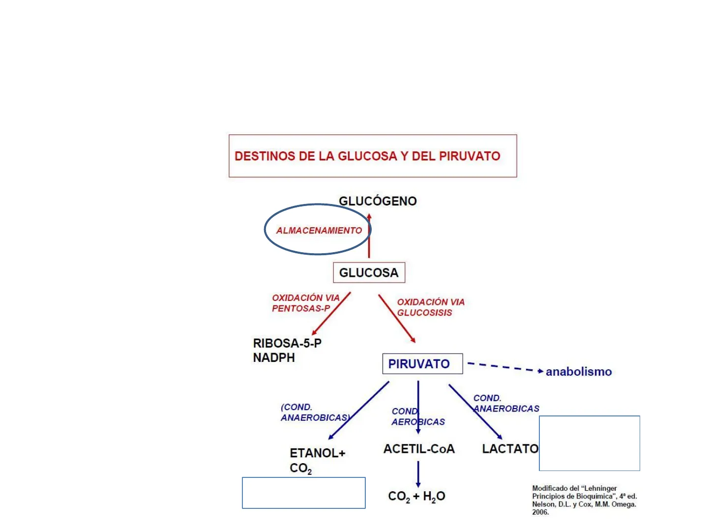 GLUCÓGENO ALMACENAMIENTO GLUCOSA OXIDACIÓN VIA PENTOSAS-P OXIDACIÓN VIA GLUCOSISIS RIBOSA-5-P NADPH PIRUVATO anabolismo COND. ANAEROBICAS (COND. ANAEROBICASY COND AEROBICAS ETANOL+ CO2 ACETIL-COA LACTATO Fermentación del ácido láctico (músculo, eritrocitos, etc.) Fermentación alcohólica (levadura) 1 CO2 + H2O Modificado del "Lehninger Principios de Bioquímica", 4ª ed. Nelson, D.L. y Cox, M.M. Omega. 2006.Metabolismo de glúcidos