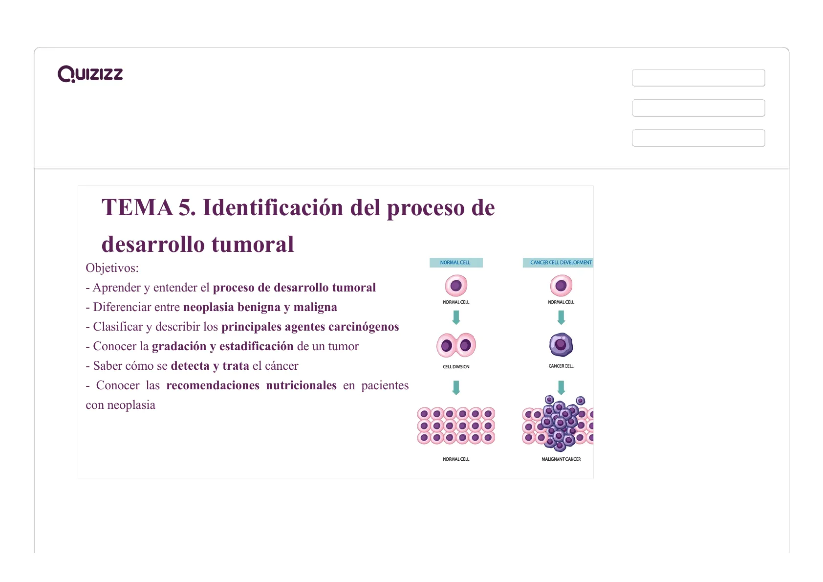 Test de Quizizz sobre la identificación del proceso de desarrollo tumoral. El Cuestionario, enfocado en Biología para nivel universitario, aborda la clasificación de neoplasias, carcinógenos y estadificación, incluyendo un glosario y preguntas de opción mùltiple.