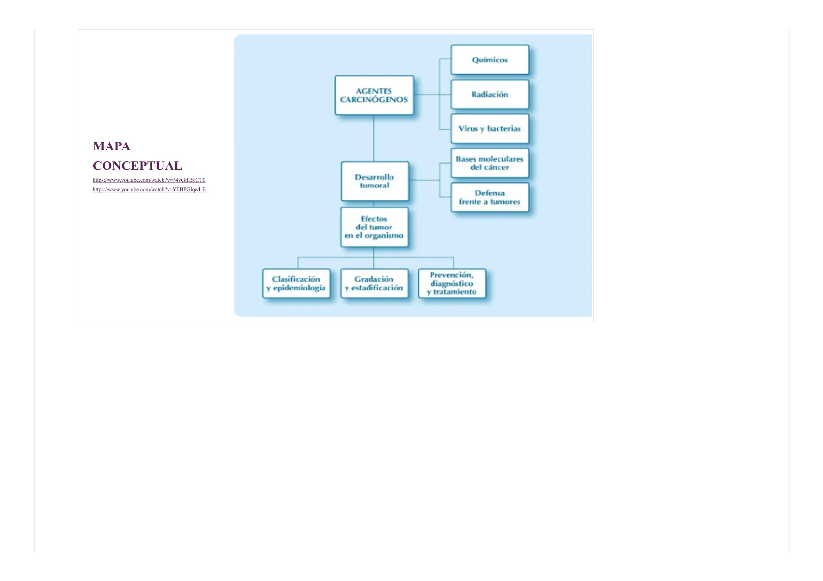 Químicos Radiación Virus y bacterias Bases moleculares del cáncer Desarrollo tumoral Defensa frente a tumores Efectos del tumor en el organismo Clasificación y epidemiología Gradación y estadificación Prevención, diagnóstico y tratamiento
