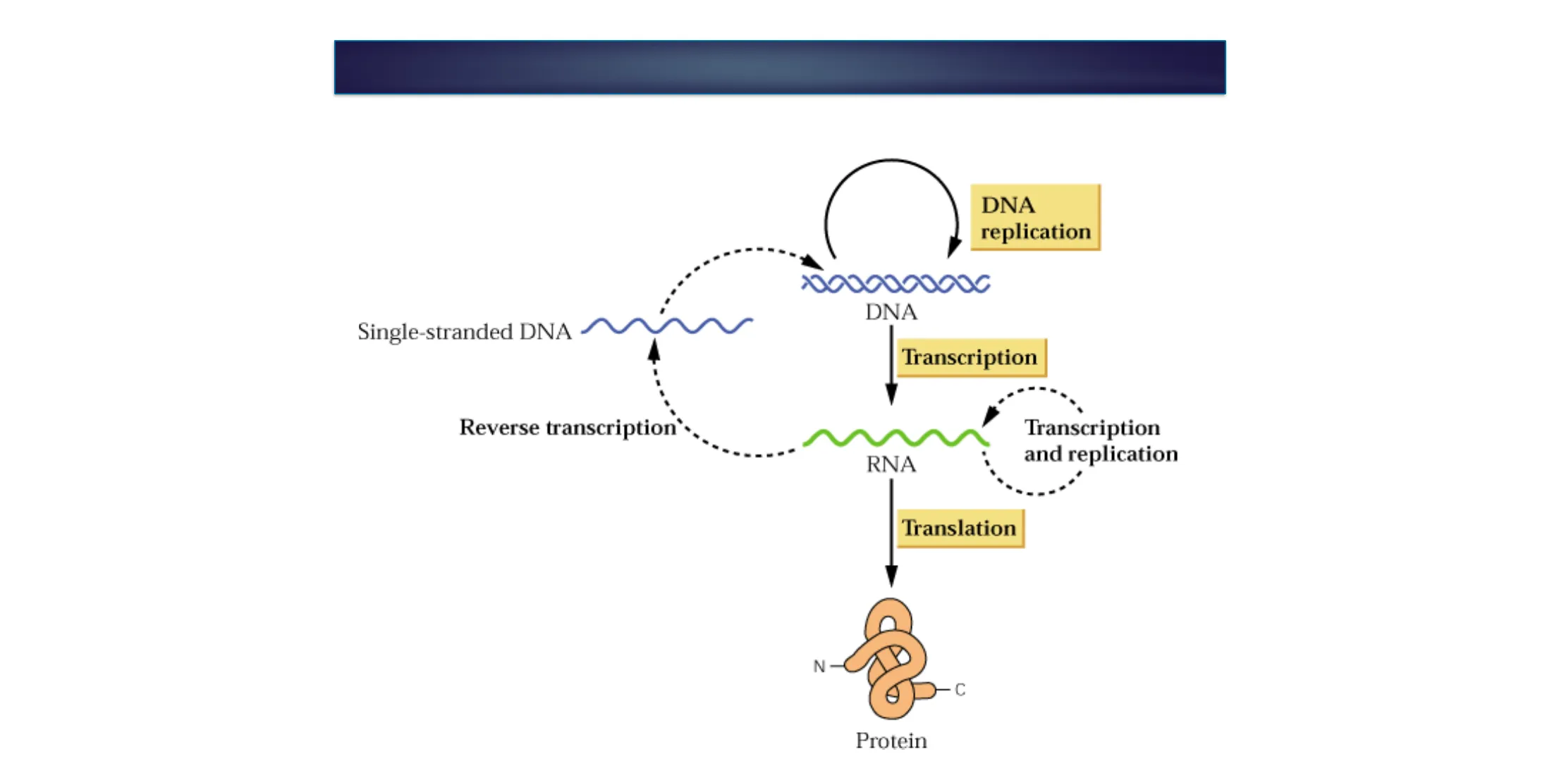 REPLICACIÓN TRANSCRIPCIÓN TRADUCCIÓNDogma Central de la Biología Molecular DNA replication 0000000000 DNA Single-stranded DNA Transcription Reverse transcription Transcription and replication RNA Translation N- -C Protein