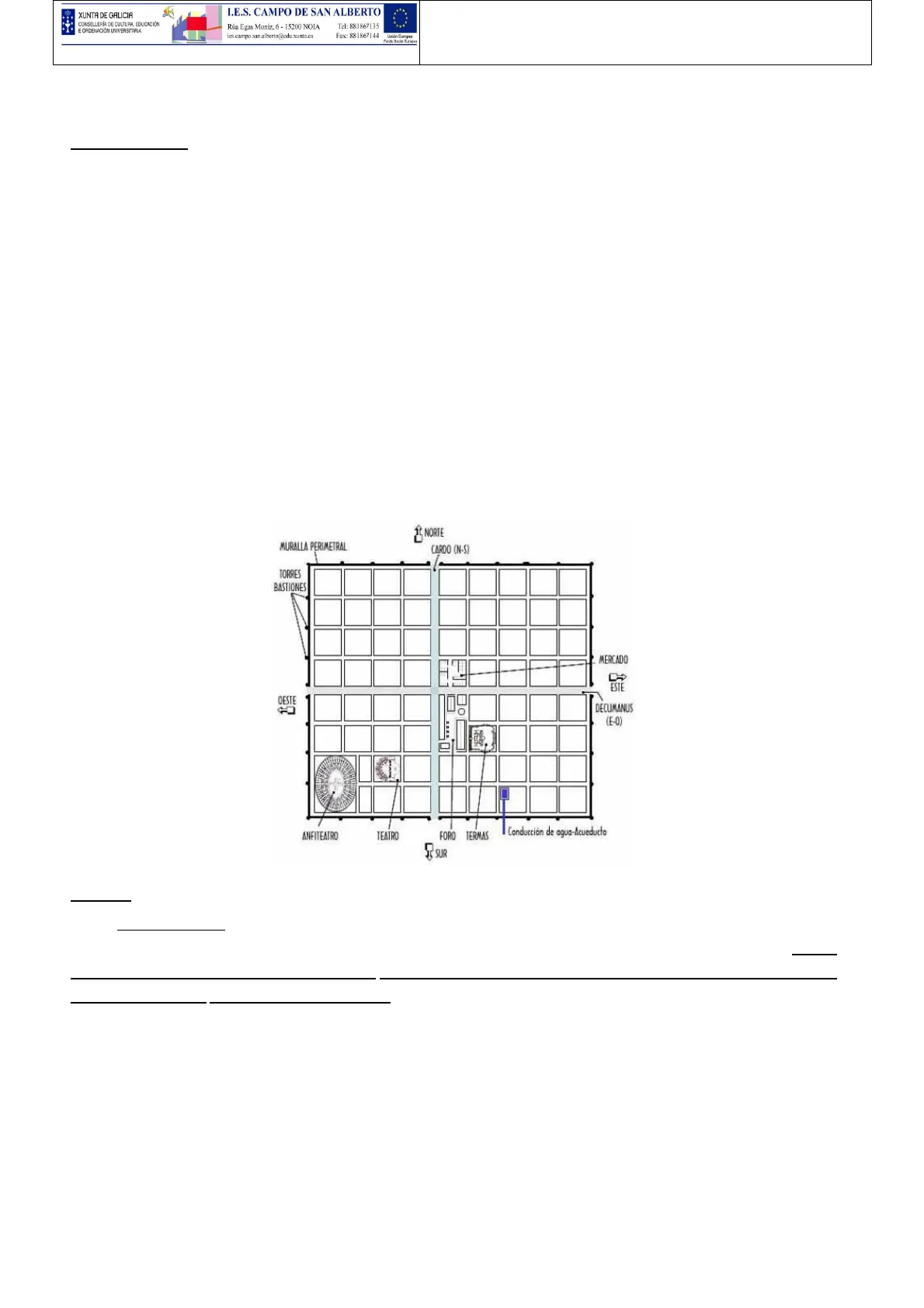 1L NORTE MURALLA PERIMETRAL CARDO (N-S) TORRES BASTIONES MERCADO ET ESTE OESTE 0 DECUMANUS (E-0) ANFITEATRO TEATRO FORO TERMAS Conducción de agua-Acueducto SUR